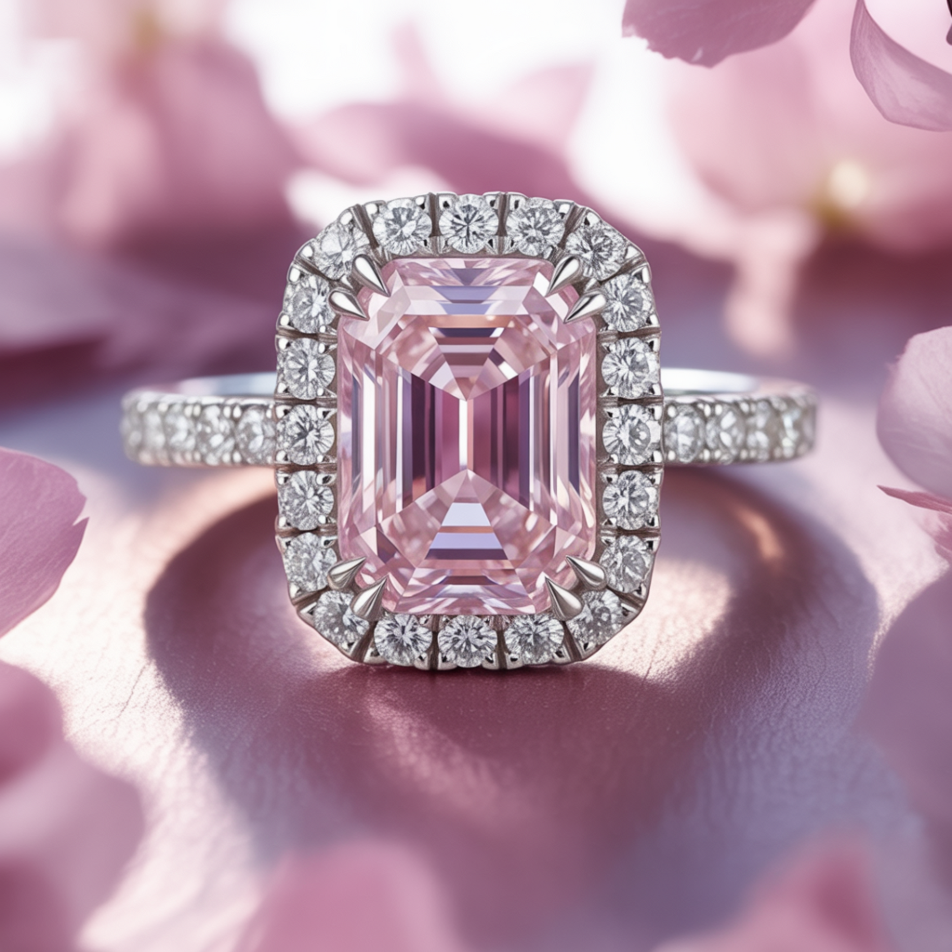 3CT Emerald Cut Pink Moissanite Halo Ring