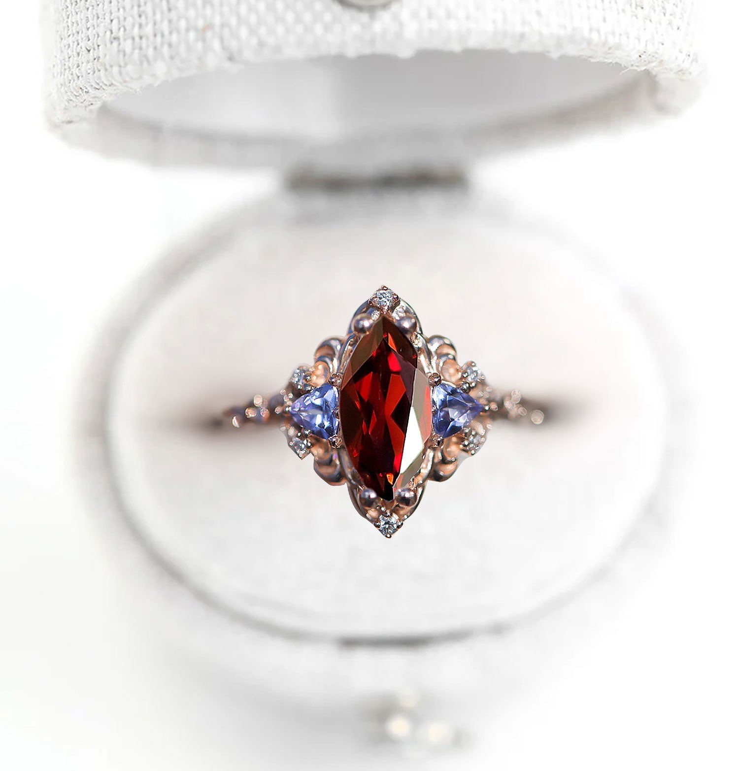 Unique Aurora Three Stone Marquise Garnet and Color Moissanite Anniversary Ring