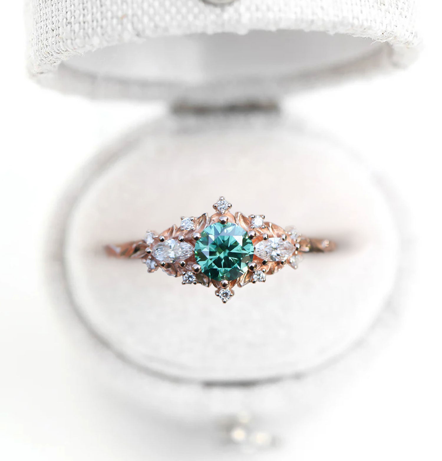 Unique Celeste Rose Three Stone Round Teal Moissanite Ring