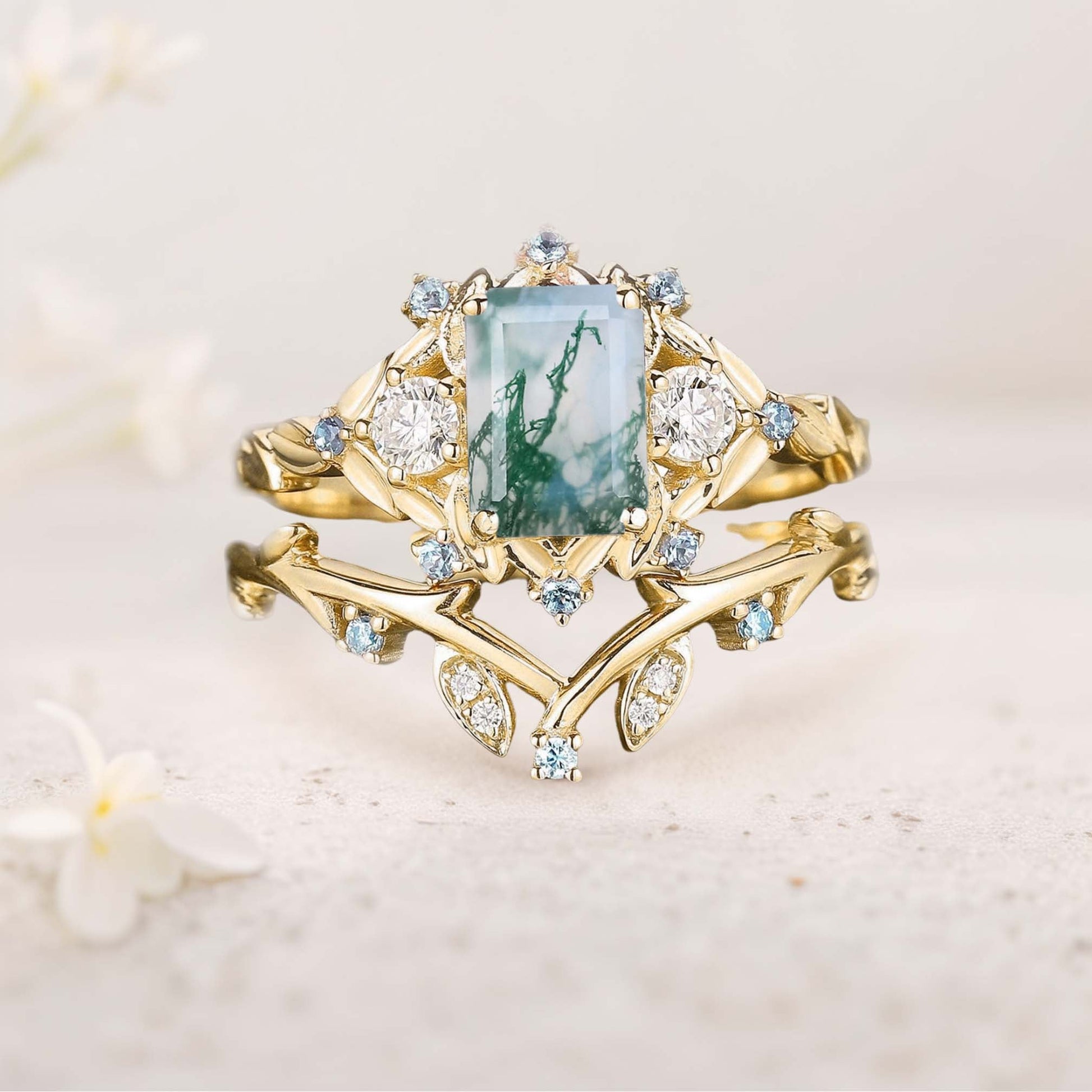Unique floral engagement rings Emerald Cut Moss Agate Floral Wedding Ring Promise Bridal Set
