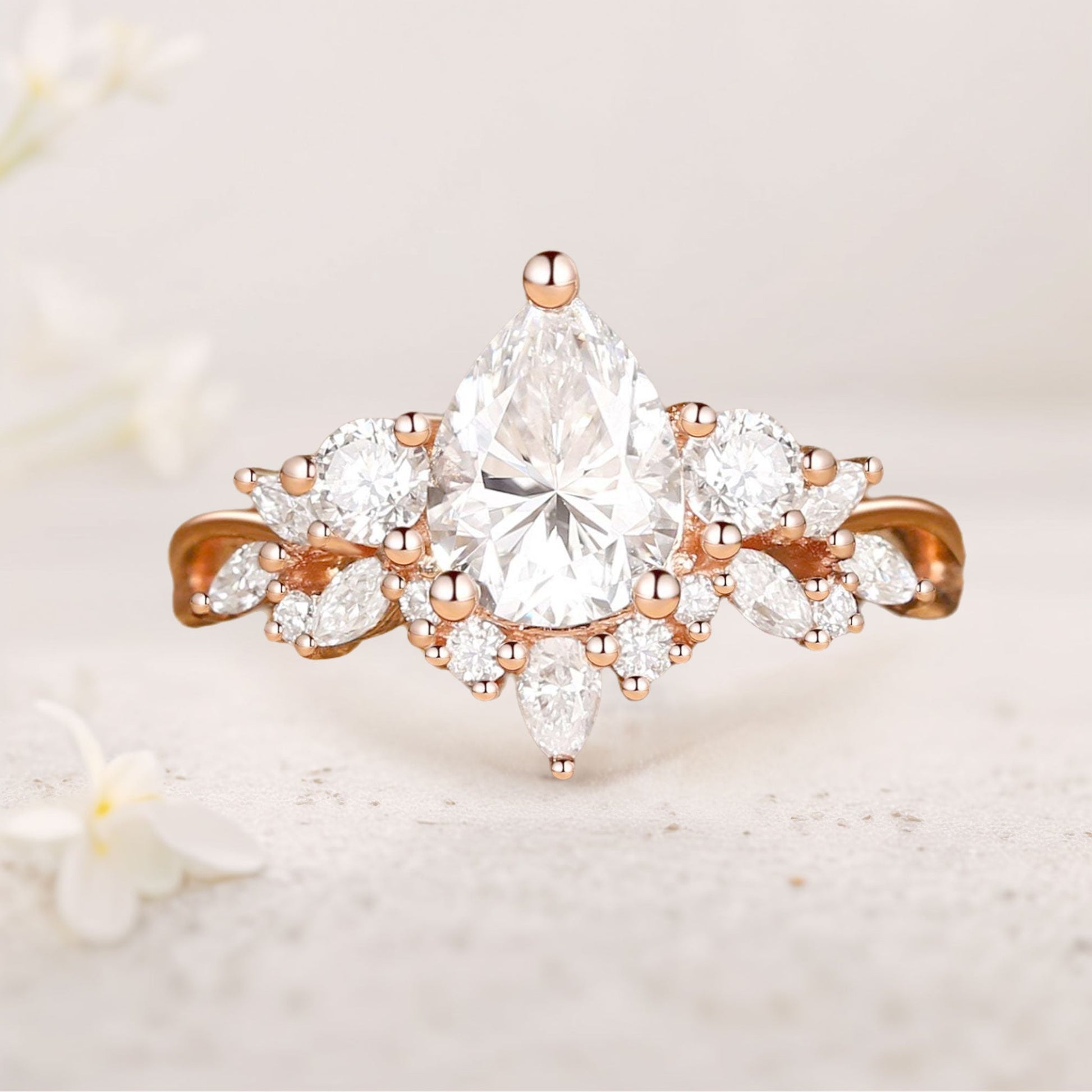 Unique floral Three Stone Pear Moissanite Cluster Engagement Ring