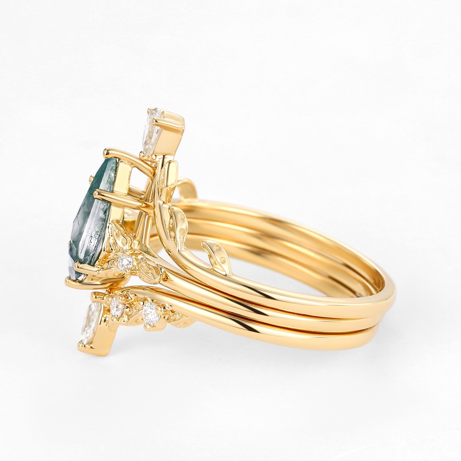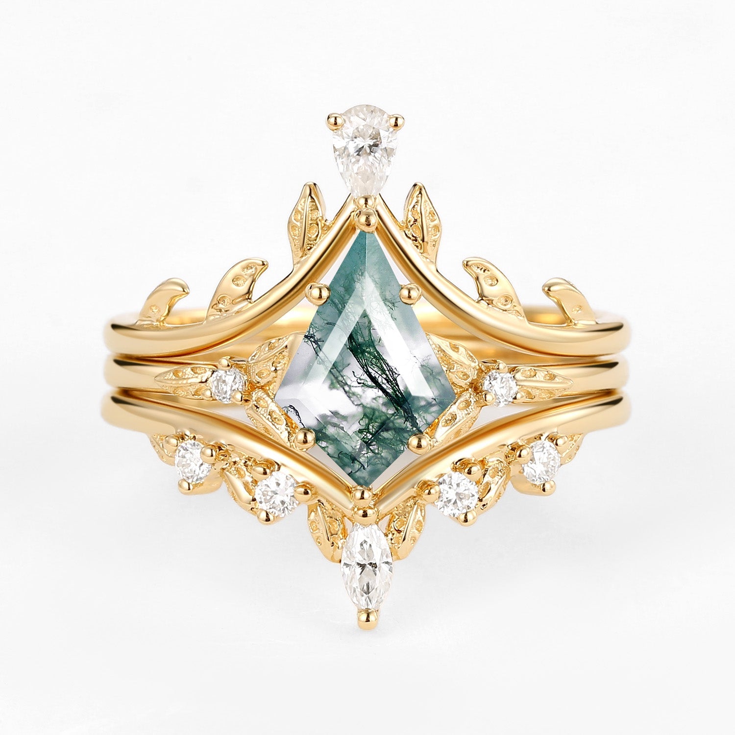 Unique Kite Cut Moss Agate Leafy Engagement Ring Set