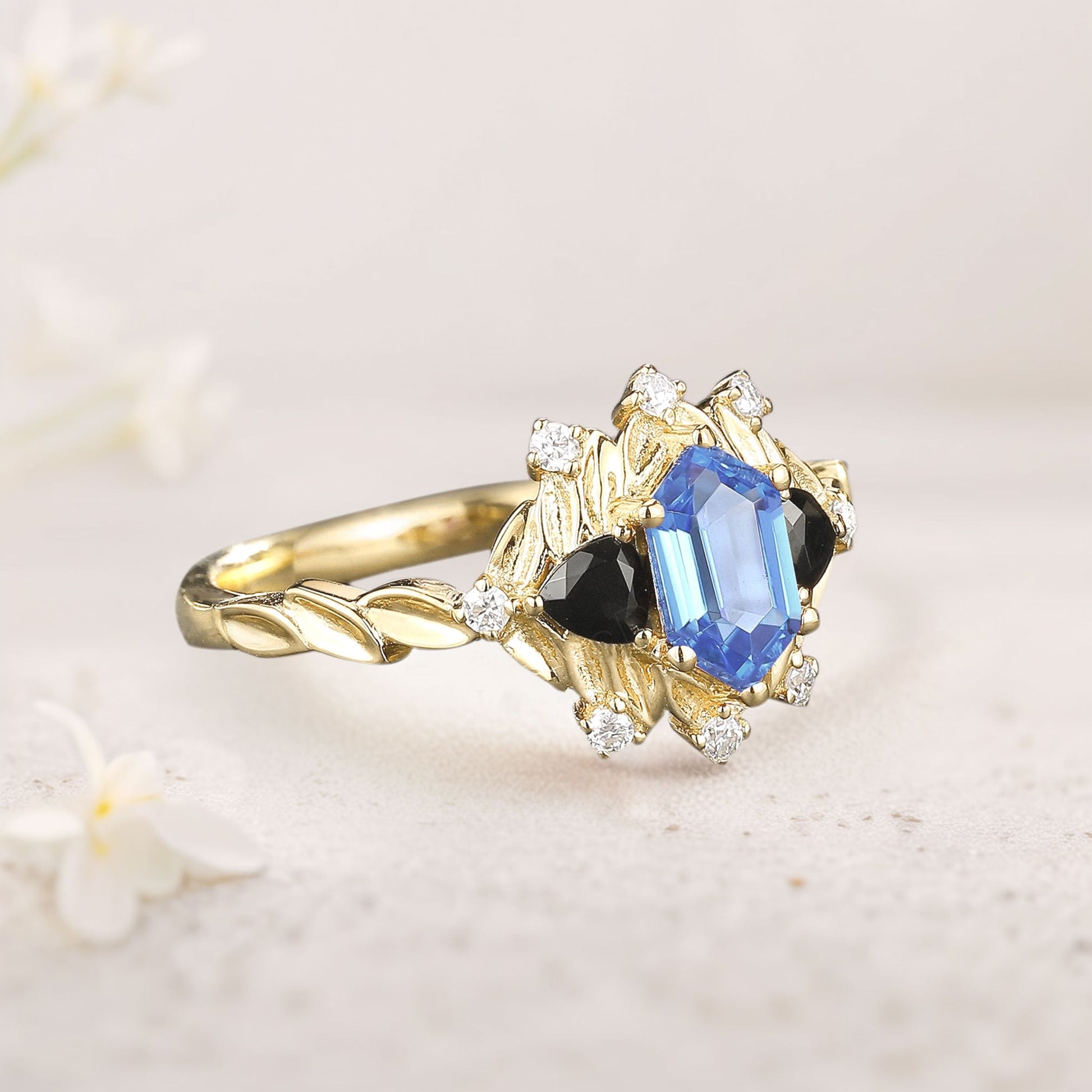 Unique Long Hexagon Sapphire and Black Onyx Leaf Engagement Ring Wedding Ring for Women