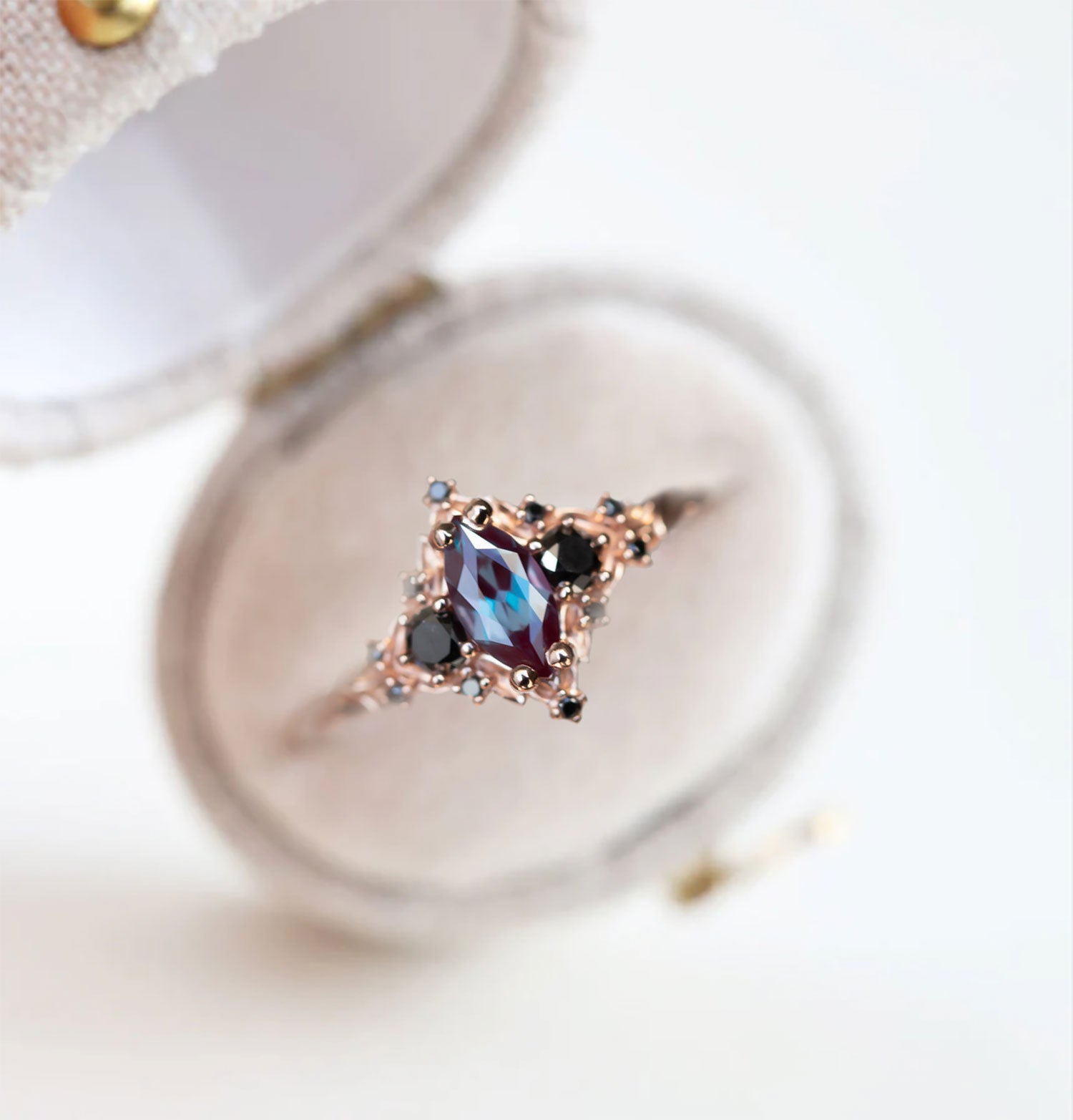 Unique Floral Rose Marquise Lab Alexandrite and Black Moissanite Ring