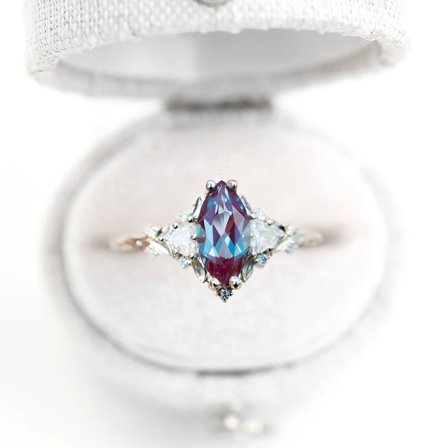 Unique Floral Rose Three Stone Marquise Lab Alexandrite Ring