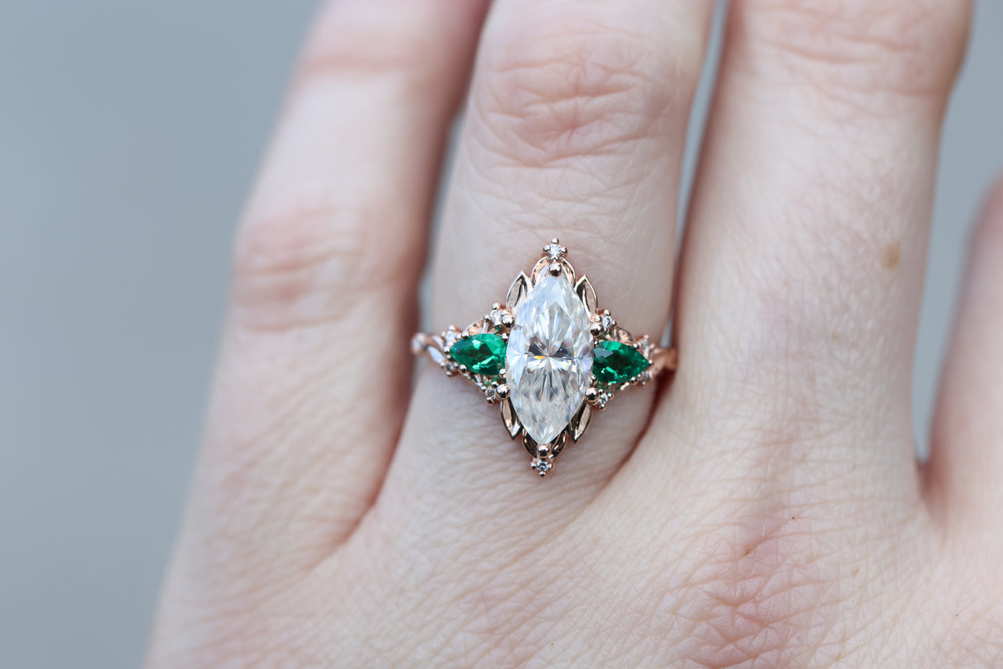 Unique Briar Rose Five Stone Marquise Moissanite and Lab Emerald Ring
