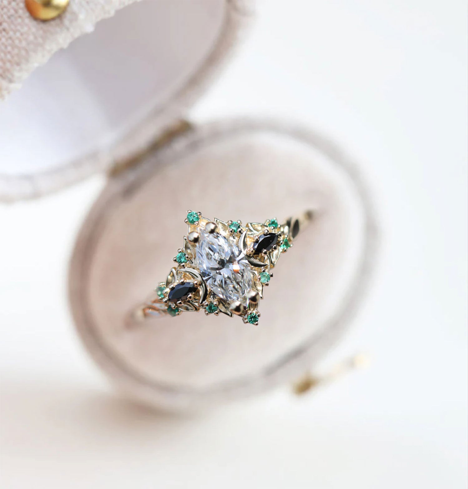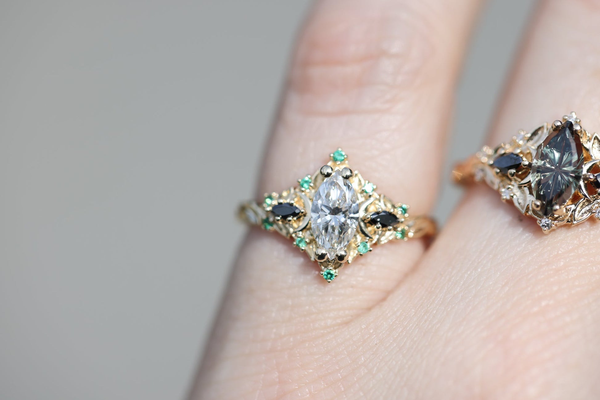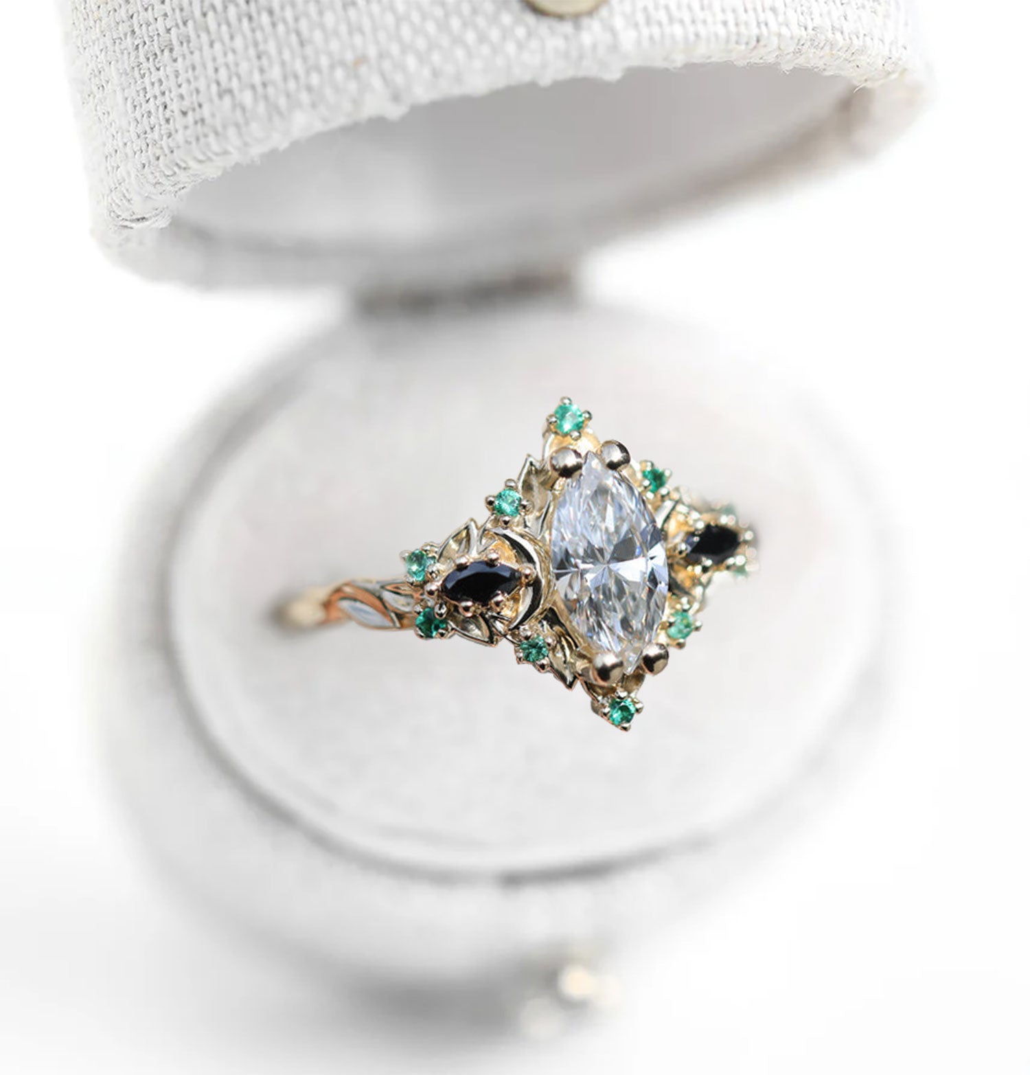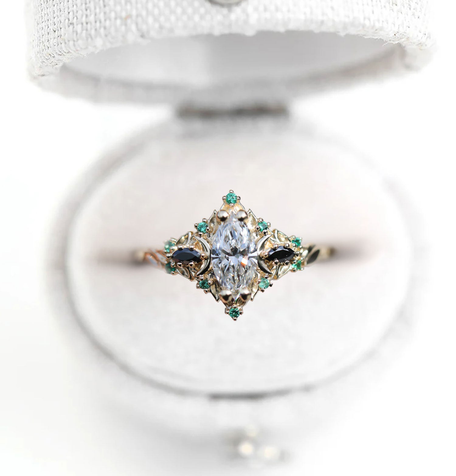 Unique Briar Moon Three Stone Marquise Moissanite and Lab Emerald Ring