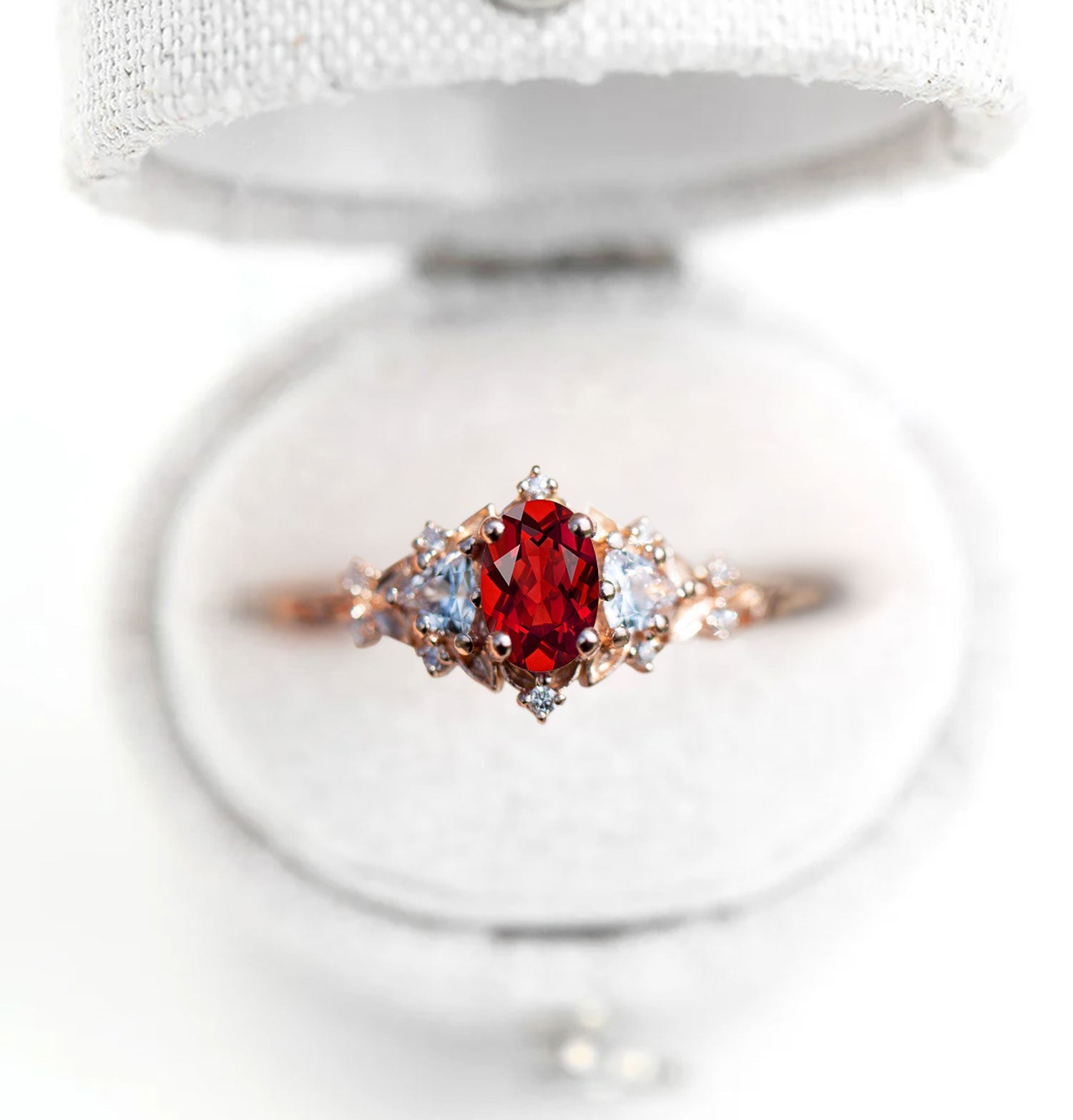 Unique Celeste Rose Oval Garnet and Moissanite Ring