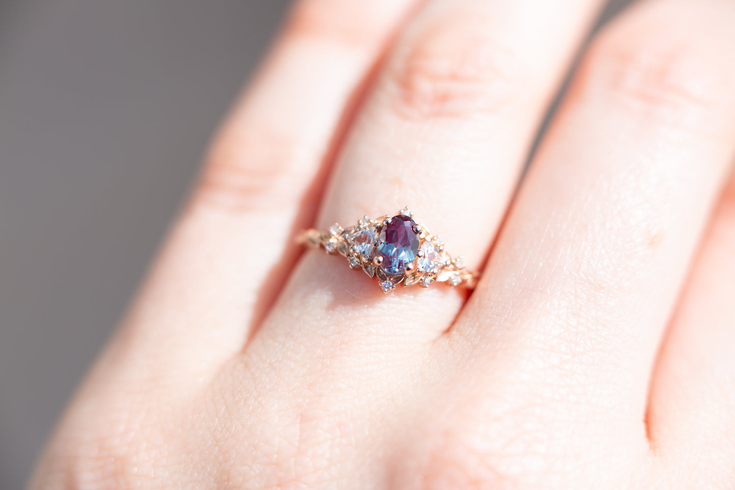 Unique Floral Rose Oval Lab Alexandrite and Moissanite Ring
