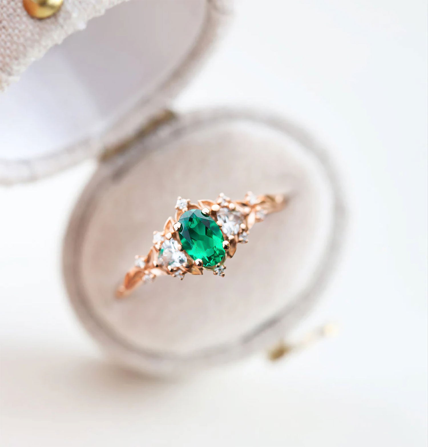 Unique Floral Rose Three Stone Oval Lab Emerald Ring