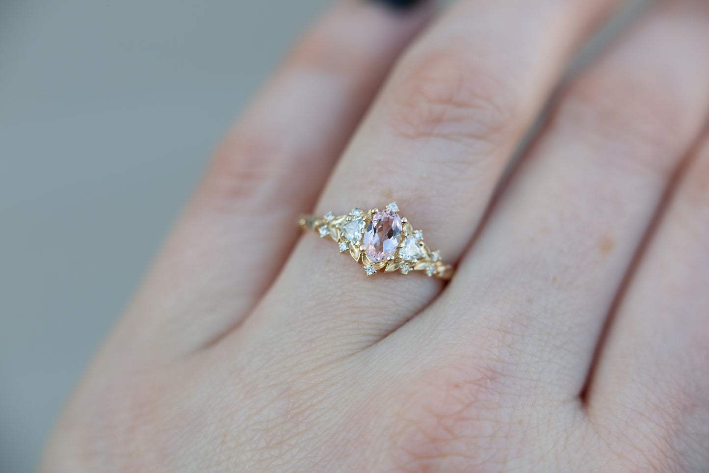 Unique Floral Rose Three Stone Oval Pink Padparadscha Ring