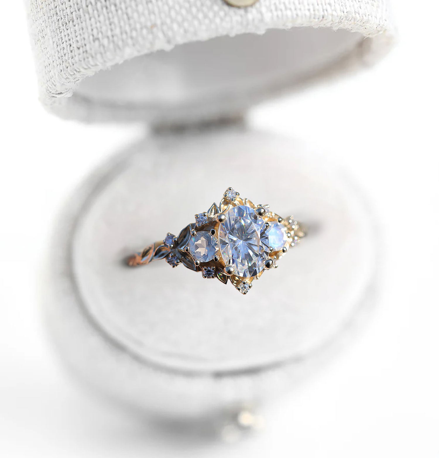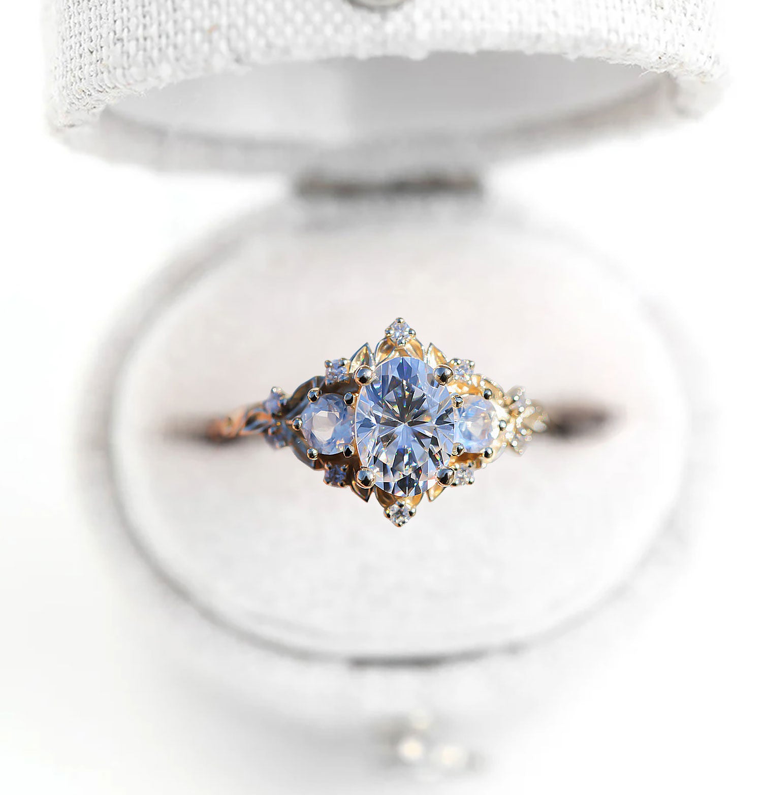 Unique Floral Rose Three Stone Oval Moissanite and Lab Moonstone Ring