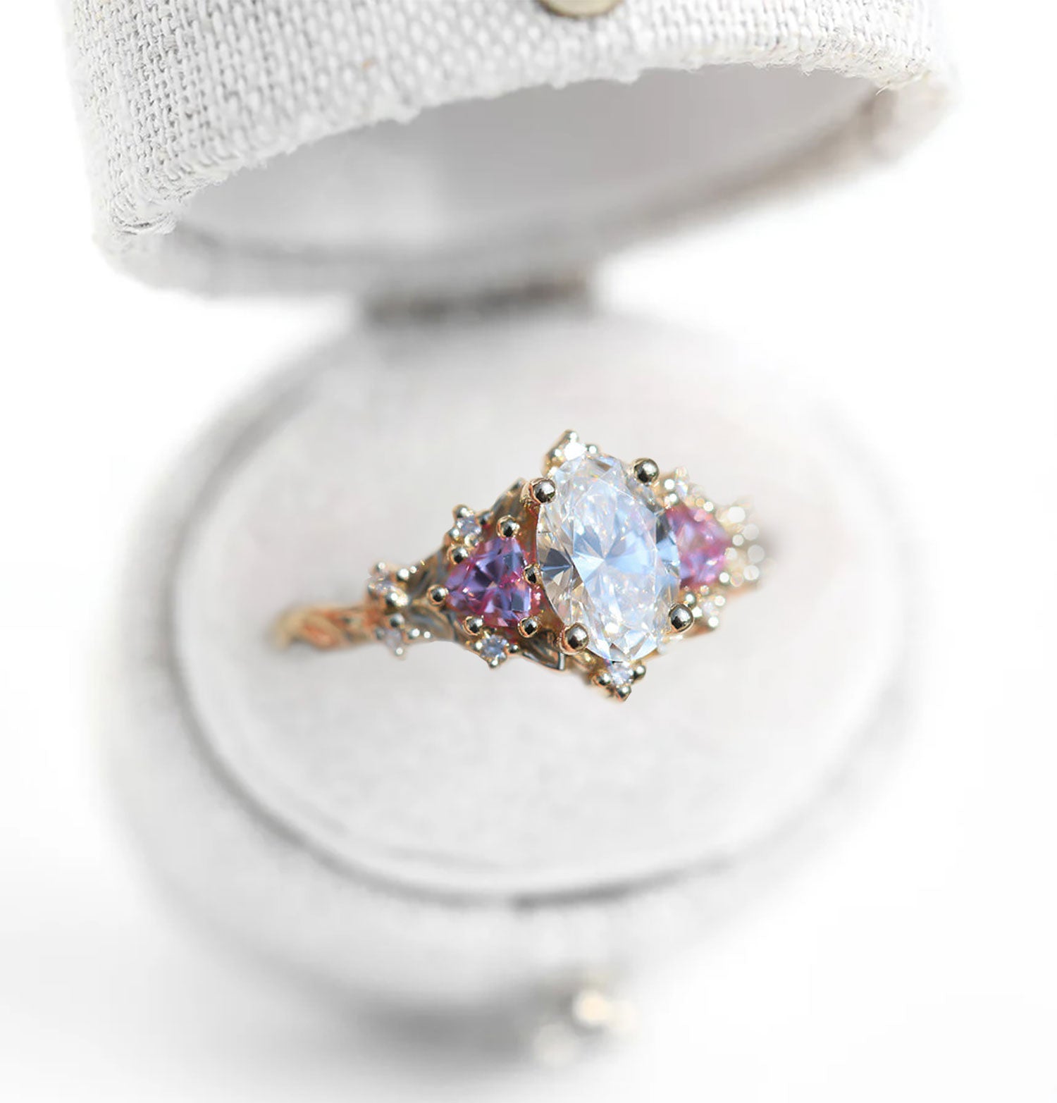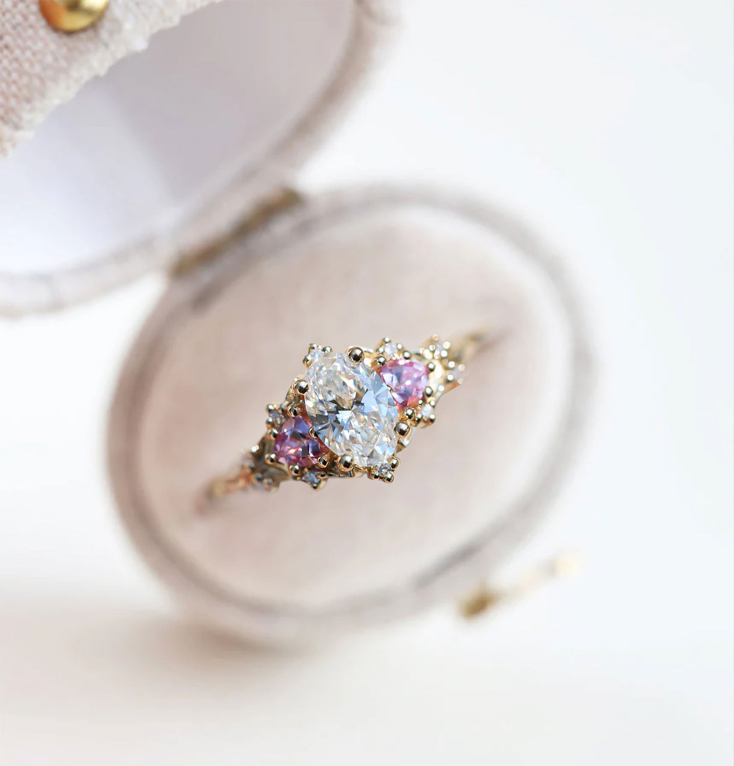 Unique Celeste Rose Three Stone Oval Moissanite and Lab Pink Sapphire Ring