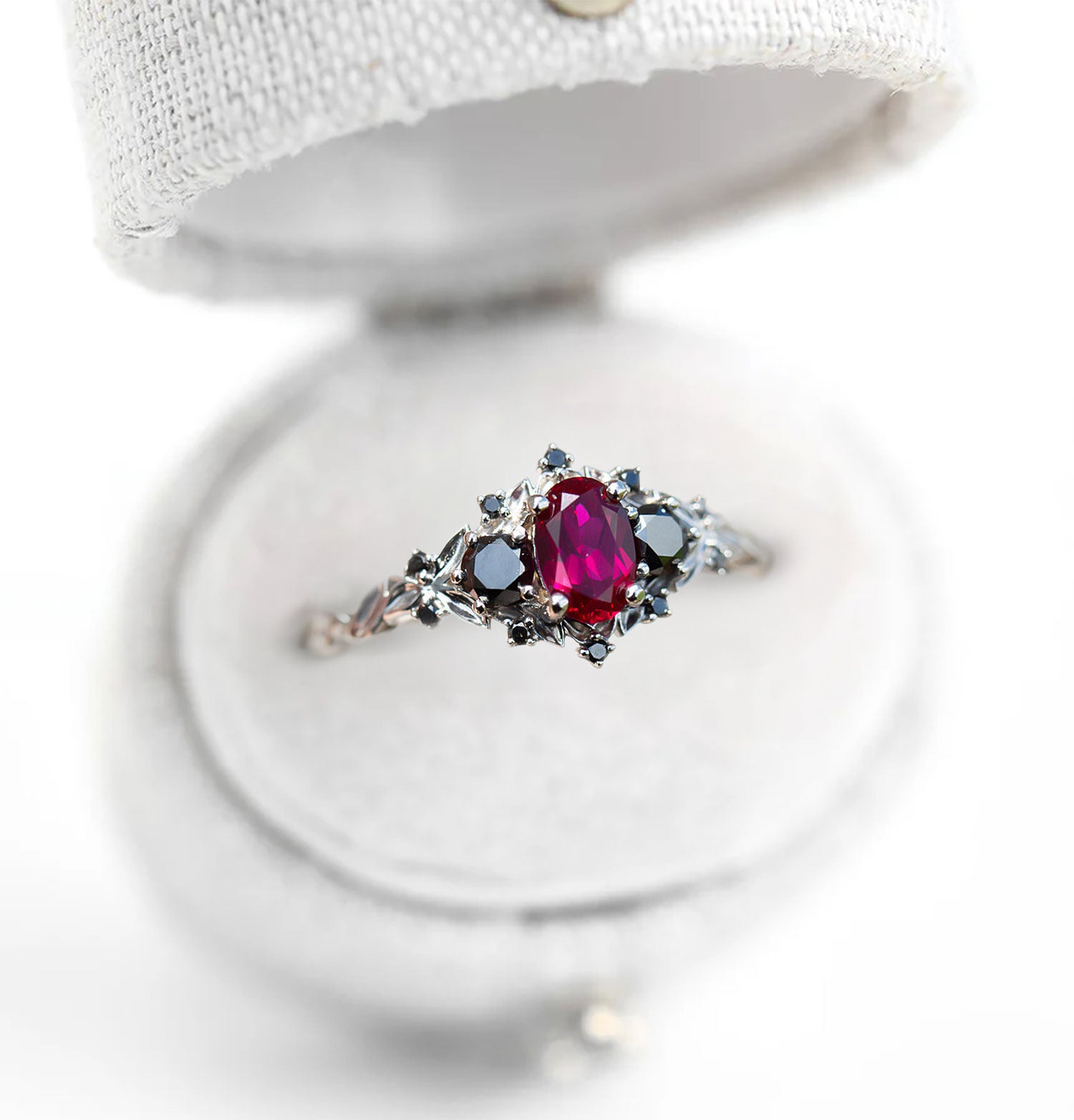 Unique Floral Rose Three Stone Oval Lab Ruby and Black onyx Ring