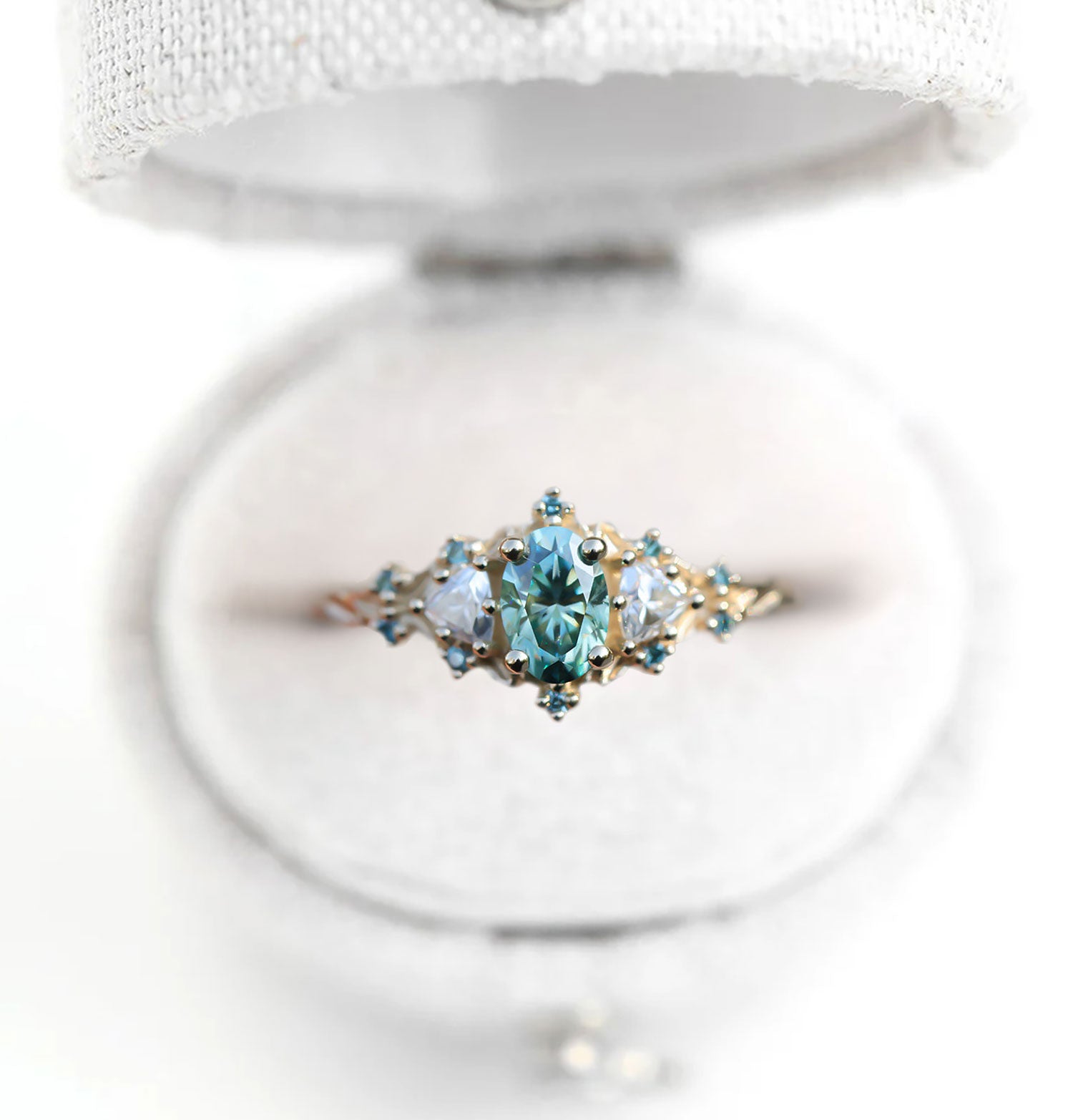 Unique Celeste Rose Oval Teal Moissanite Ring