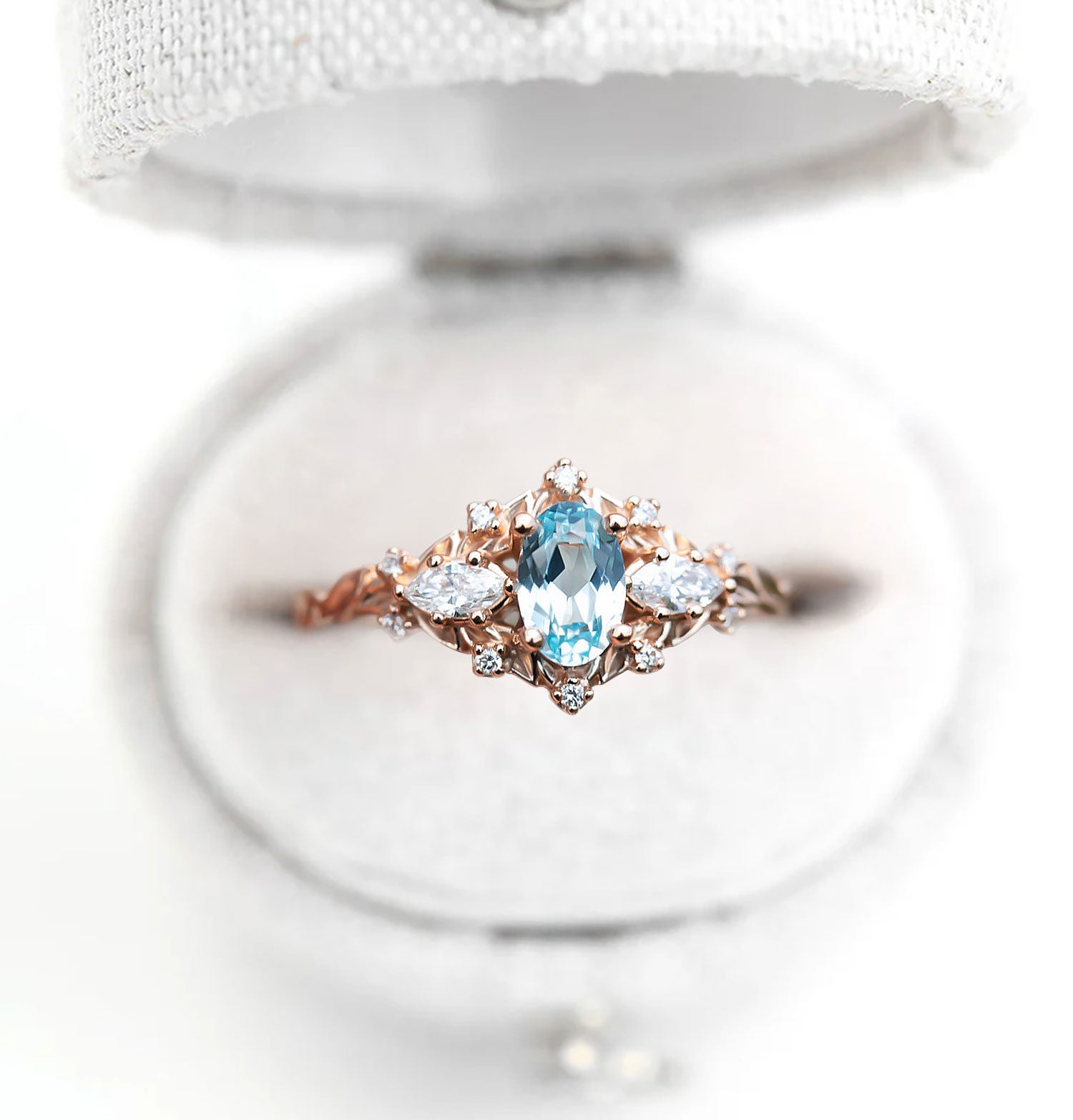 Unique Floral Rose Three Stone Oval Topaz Ring