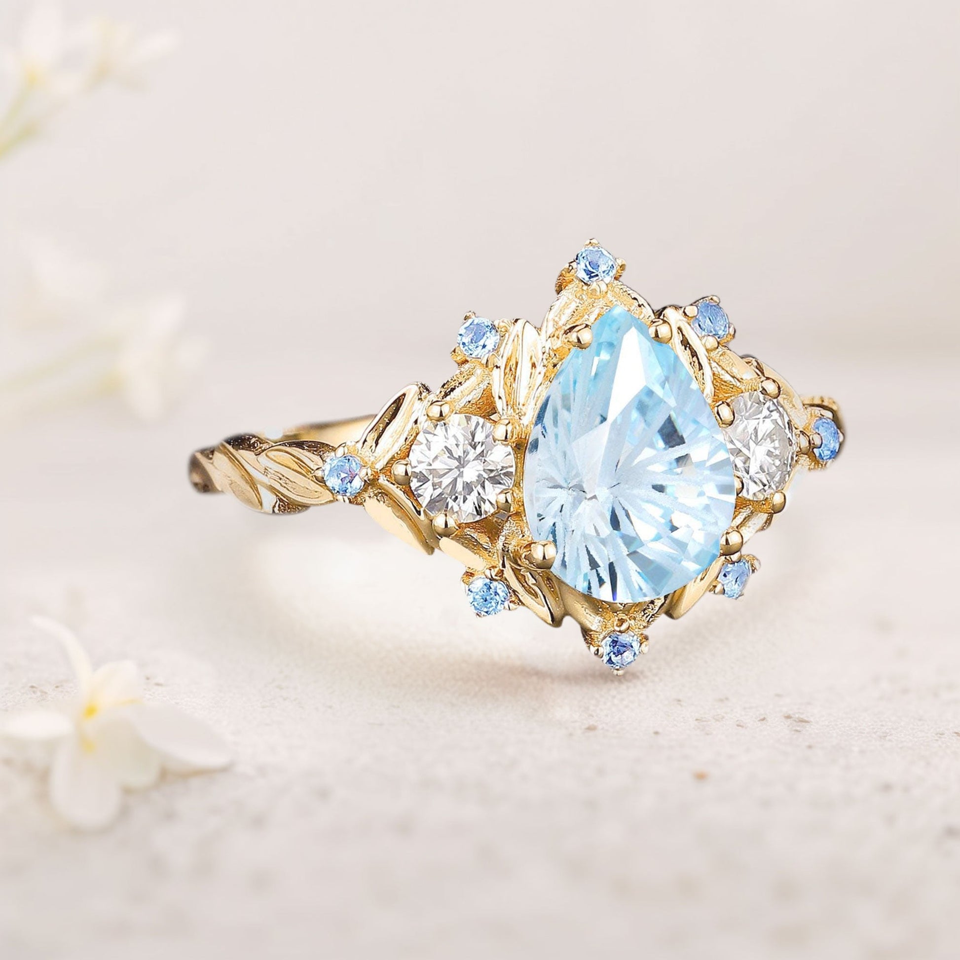 Unique Pear Aquamarine Cluster Leaf Wedding Ring Handmade Anniversary Ring Gift For Women