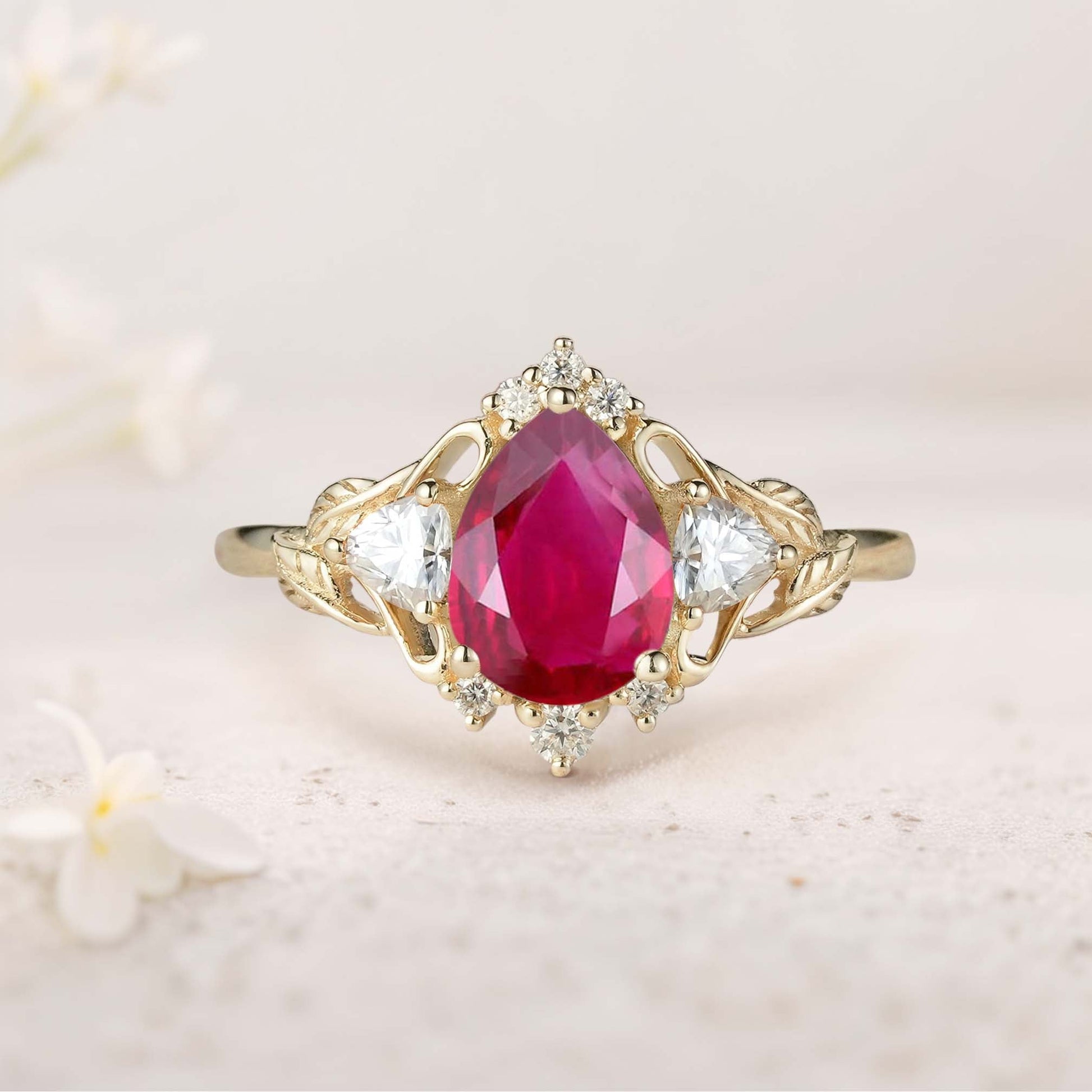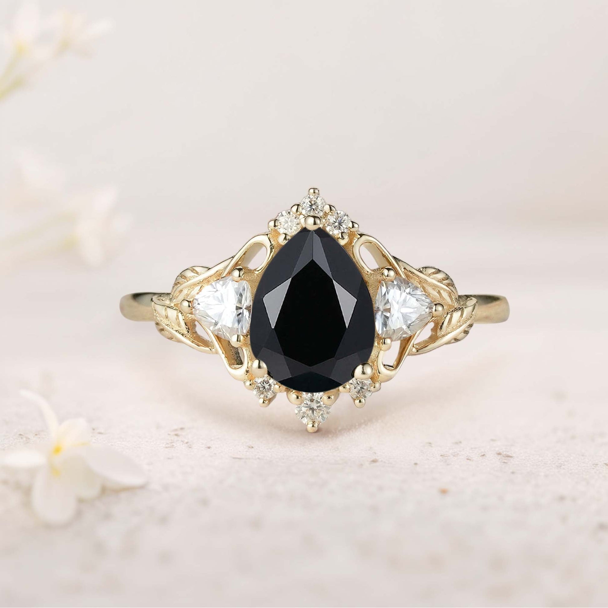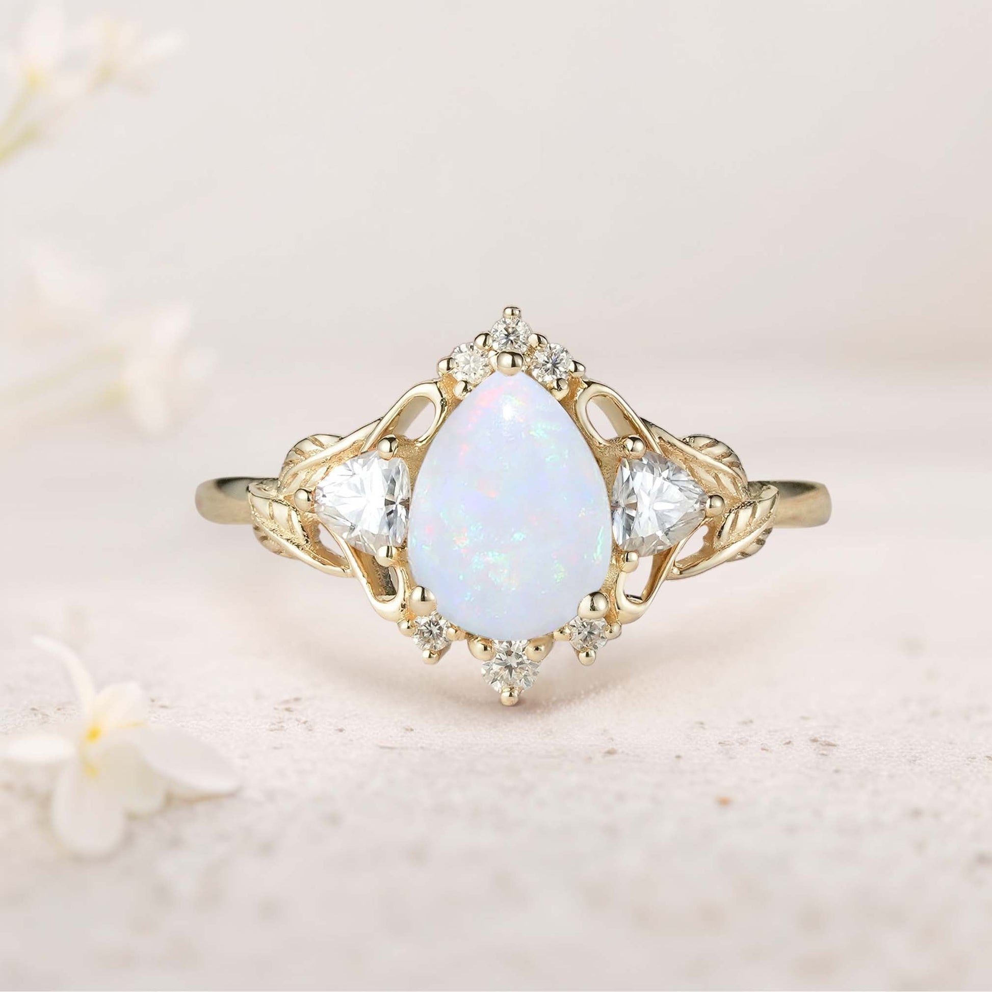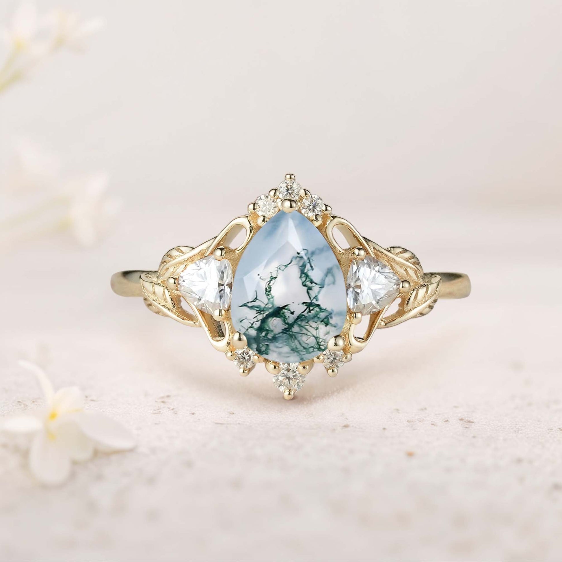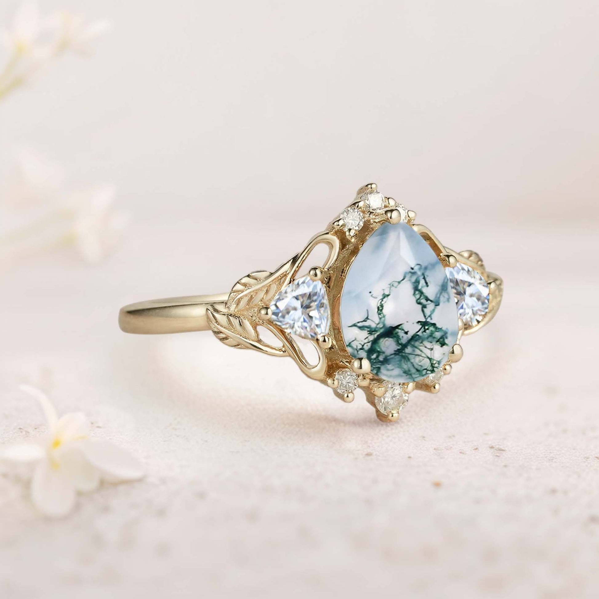 Unique floral engagement rings Pear Moss Agate and Moissanite side stones Leaf Ring Engagement Ring