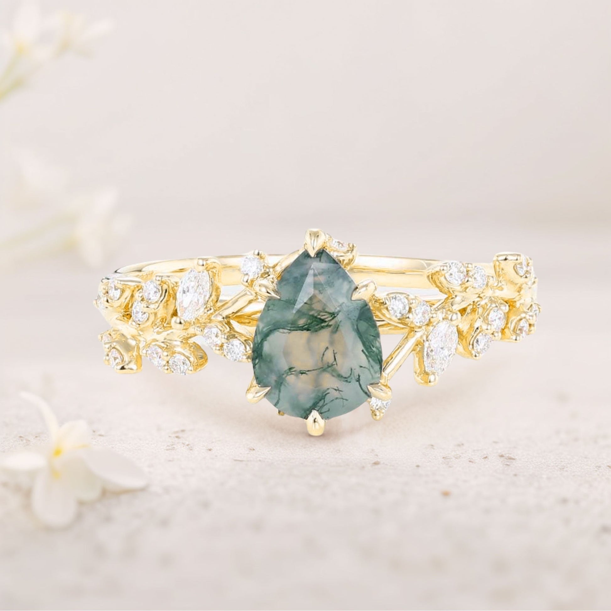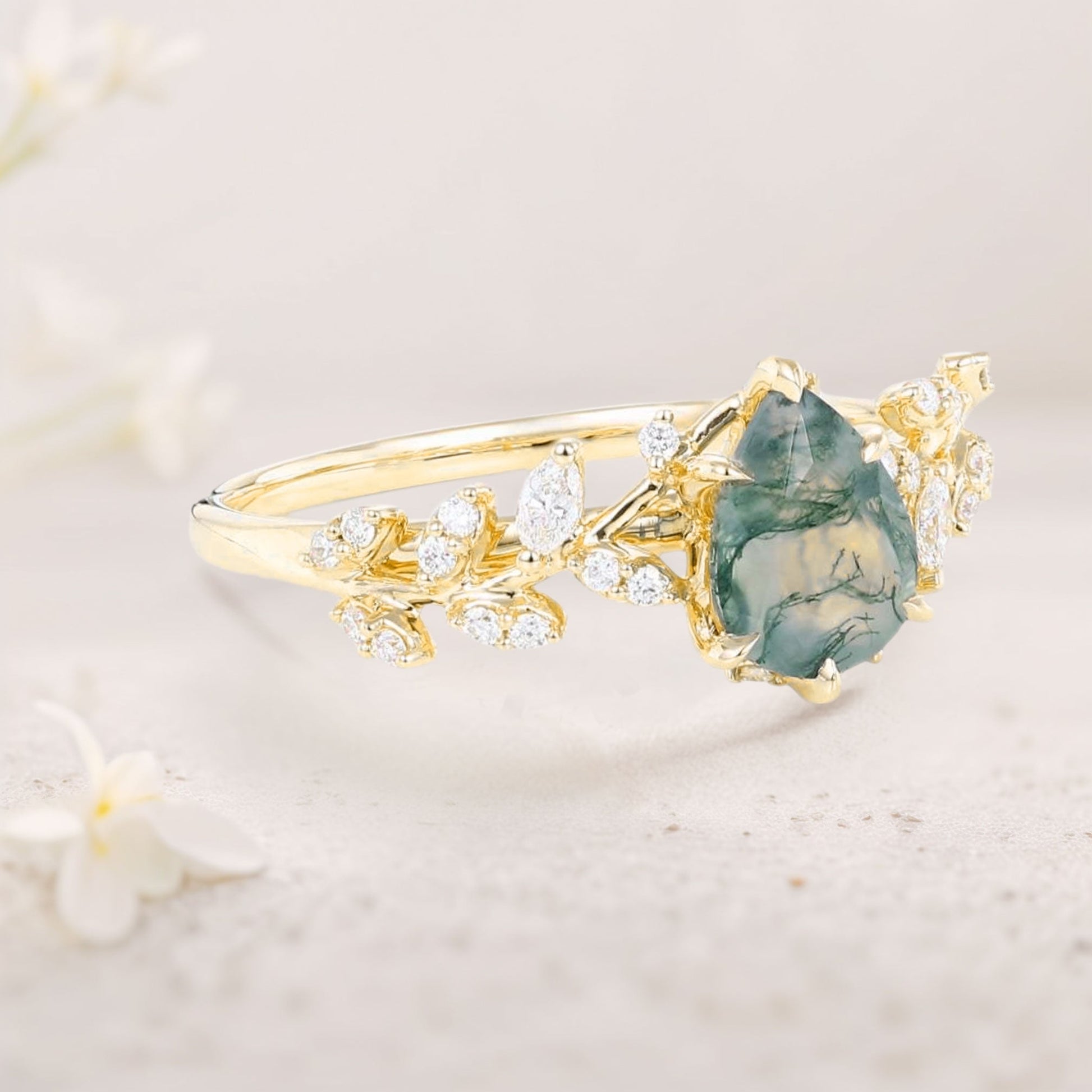 Unique floral engagement ringsPear Moss Agate Leaf Engagement Ring Mystical Garden Bridal Ring Promise Ring