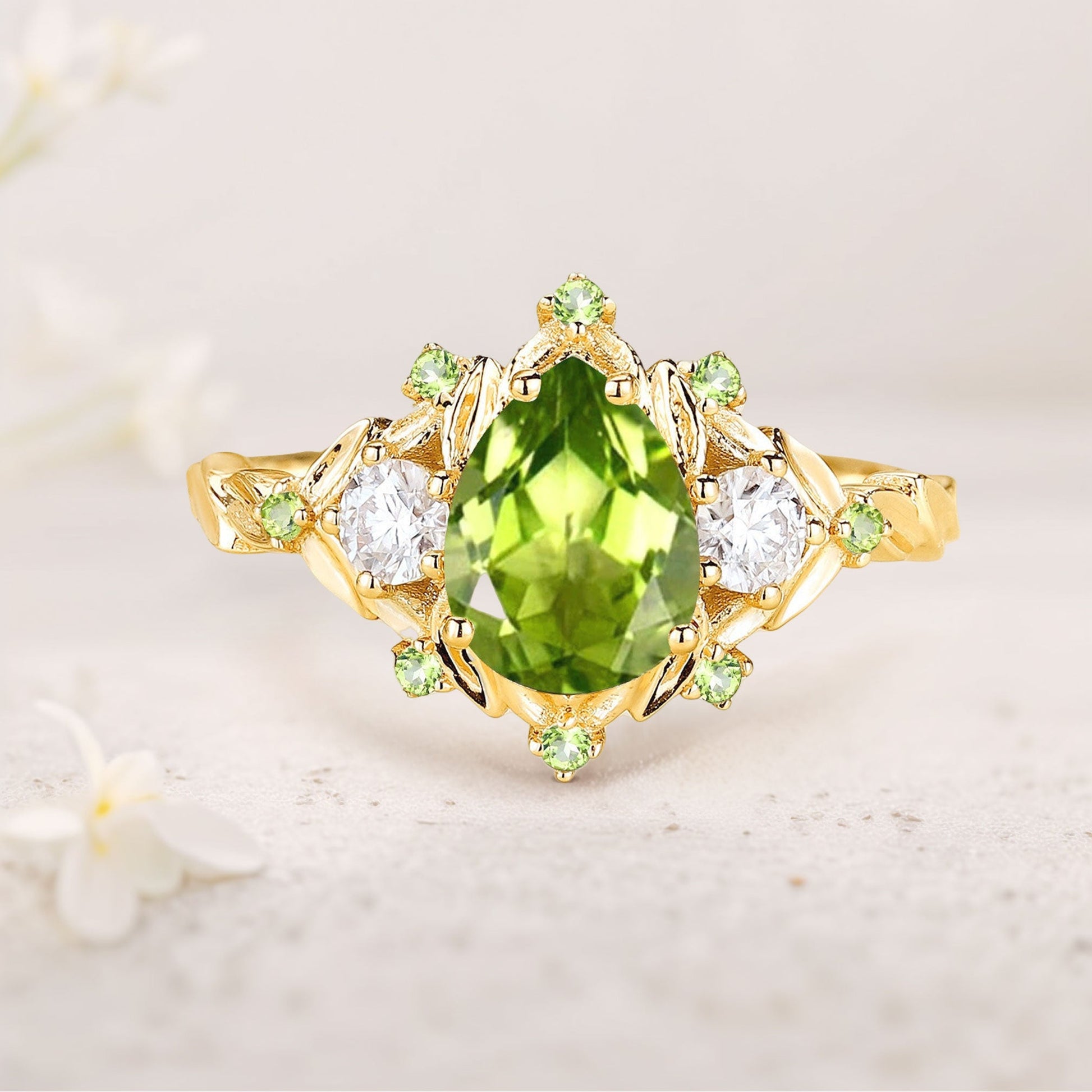 Unique floral engagement rings Pear Peridot Flower Engagement Ring Peridot Halo Leaf Wedding Ring