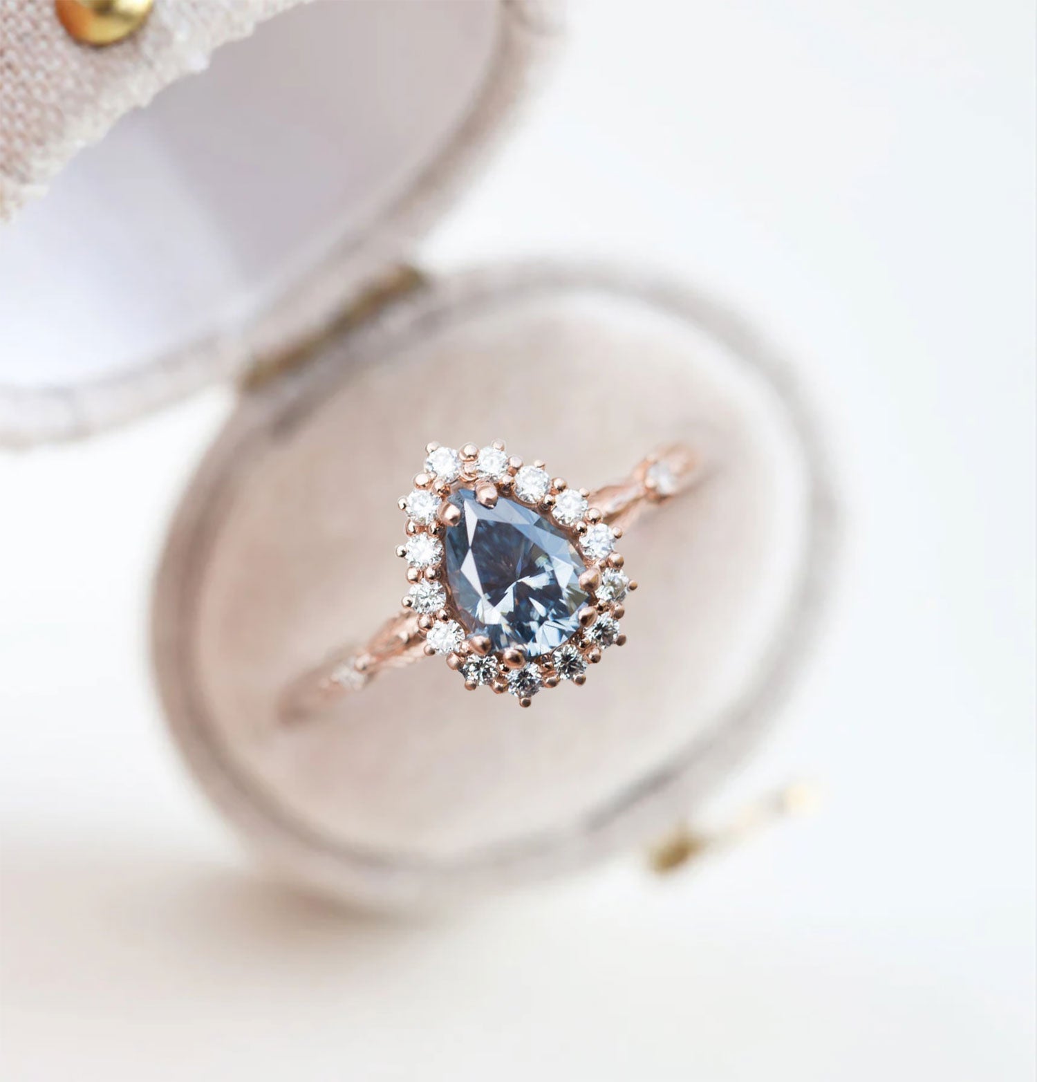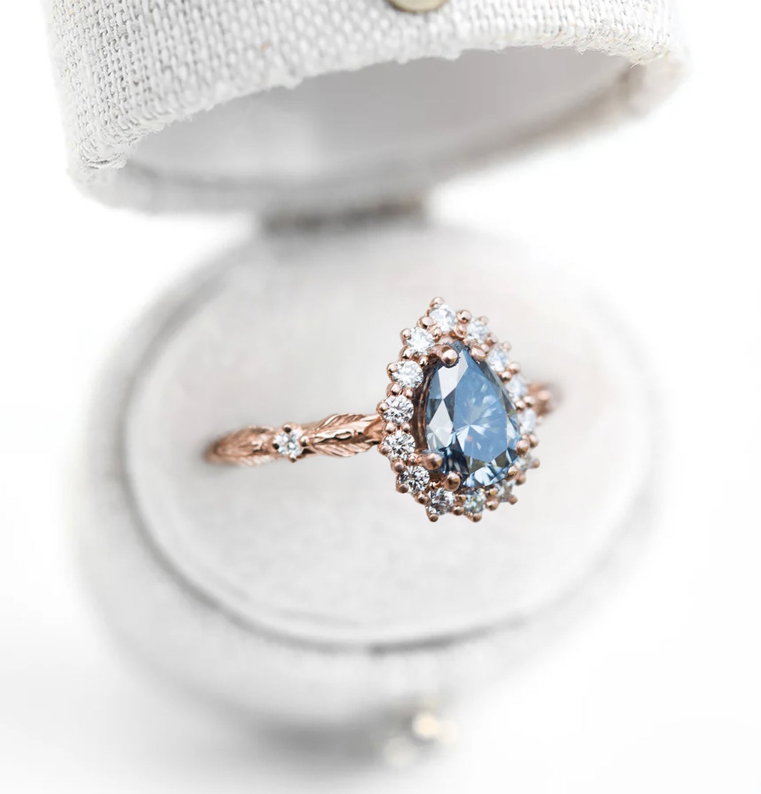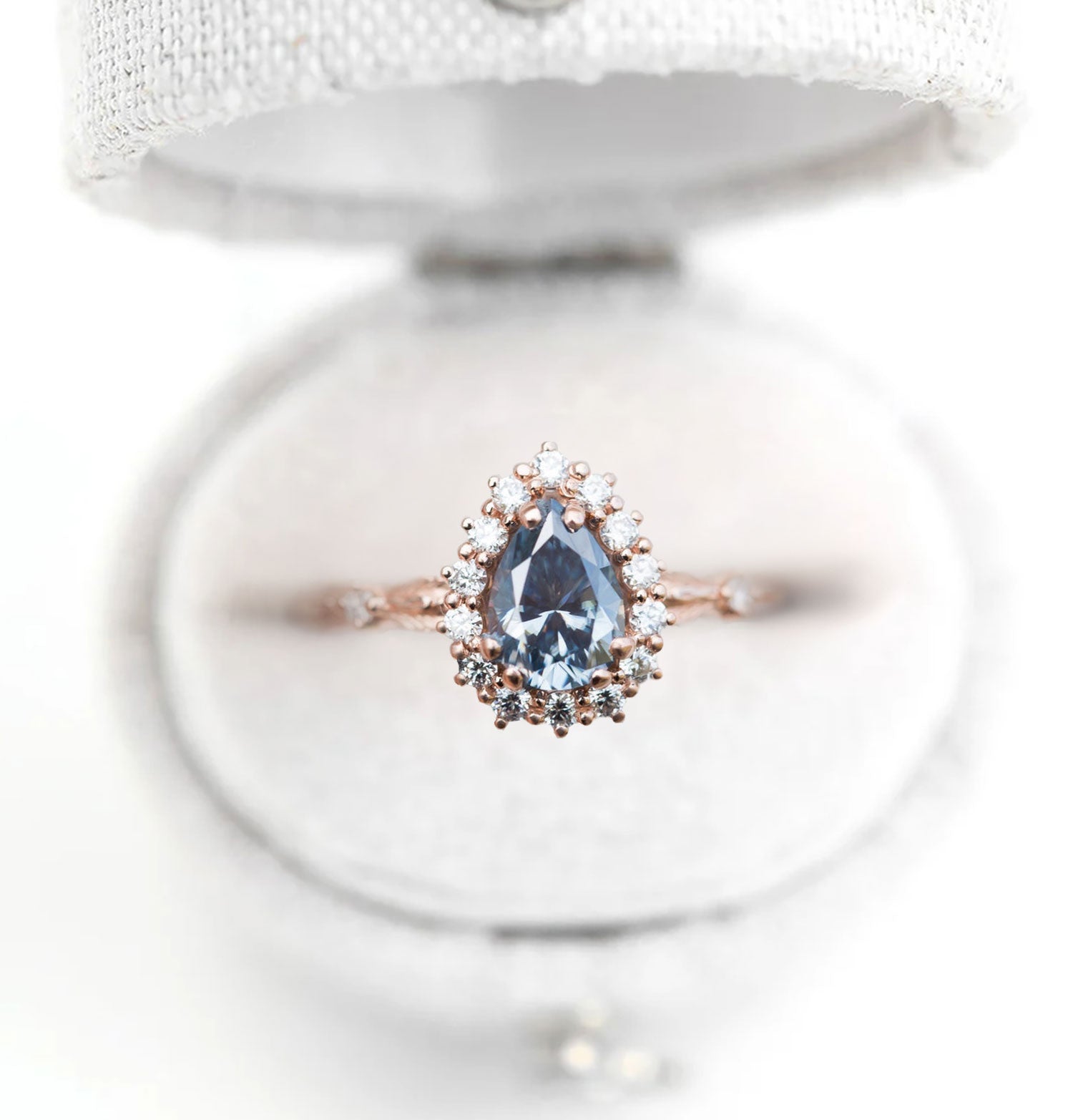 Unique Halo Leaf Pear Blue Grey Moissanite Ring