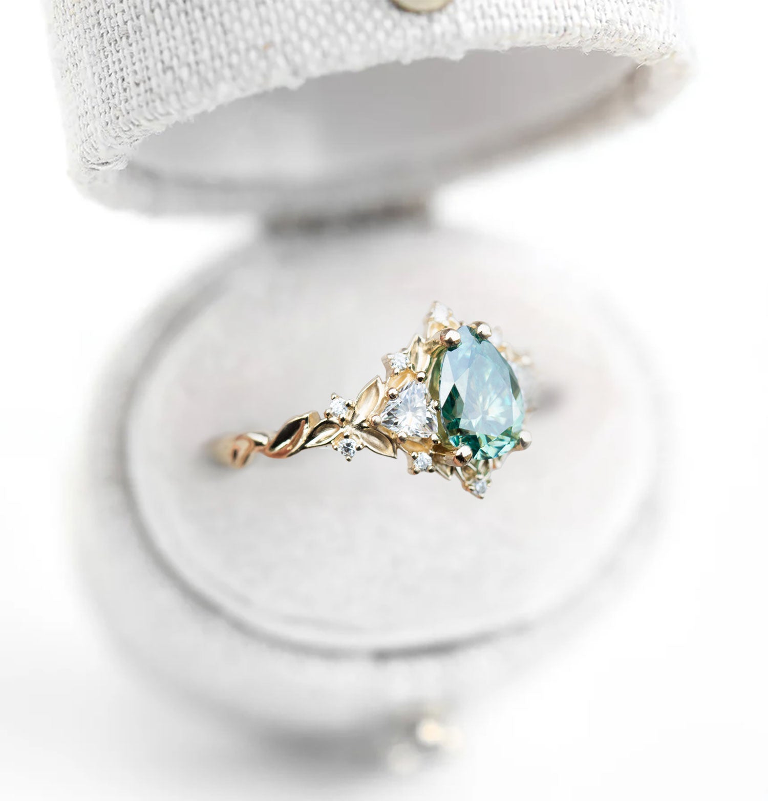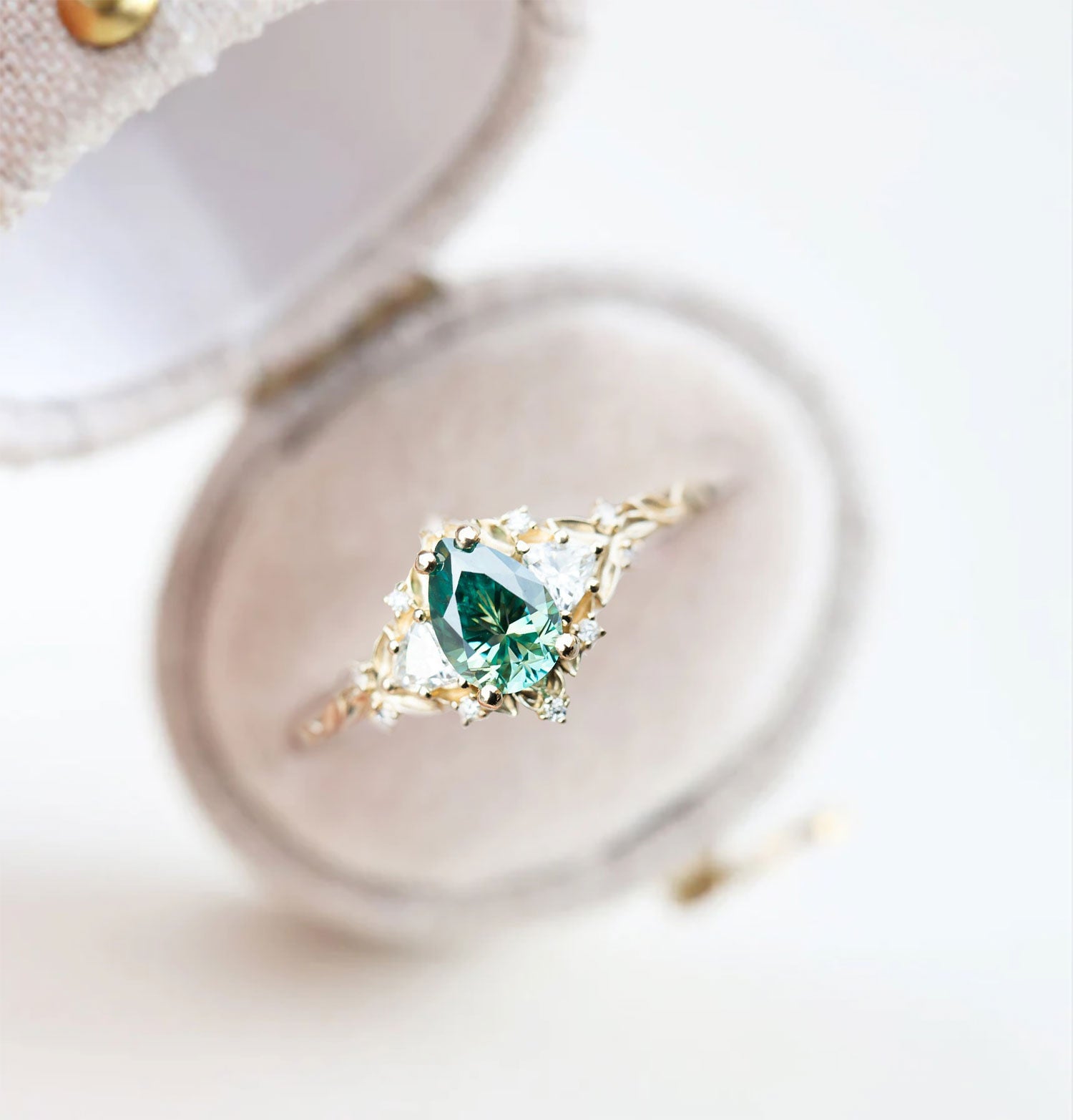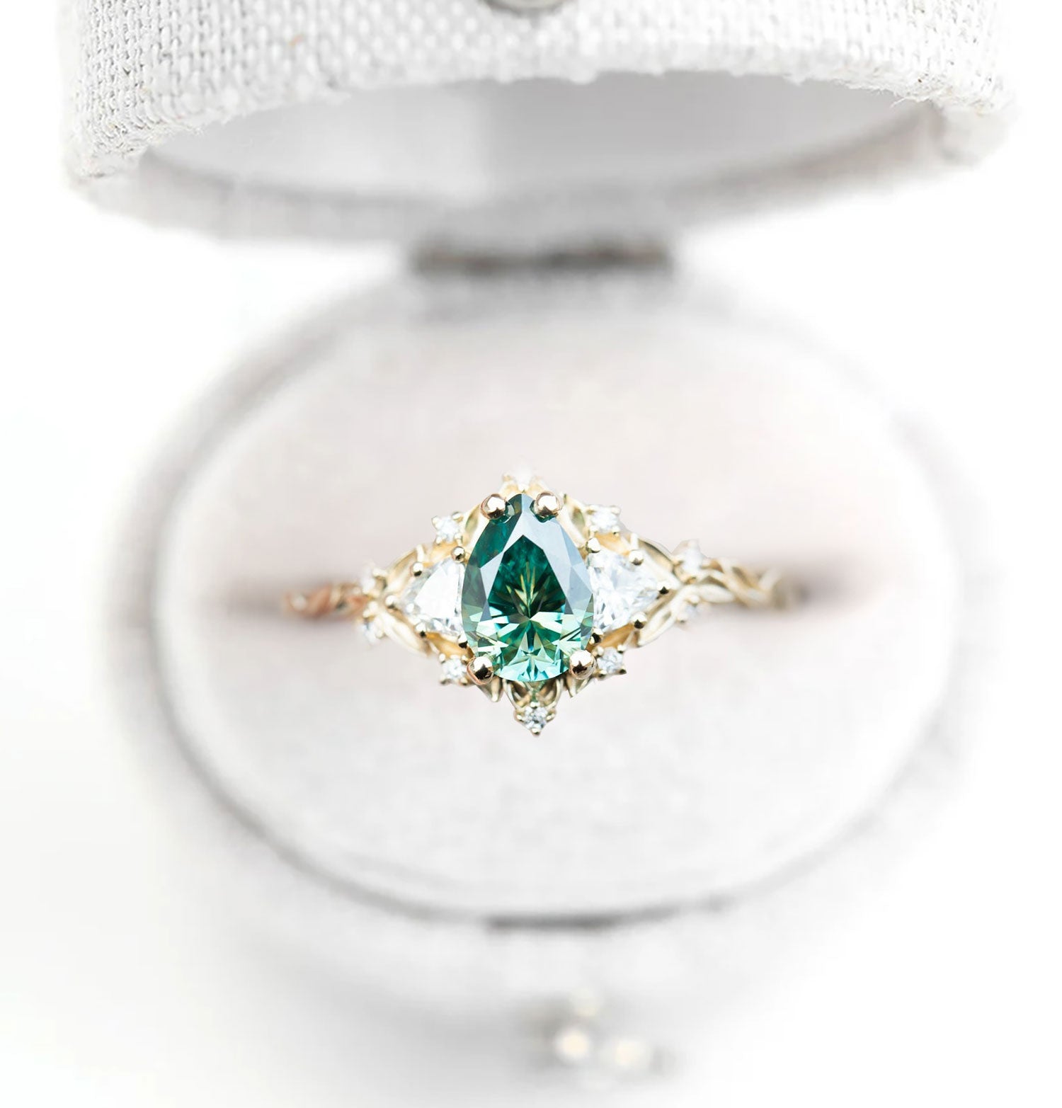 Unique Celeste Rose Three Stone Pear Teal Moissanite Ring