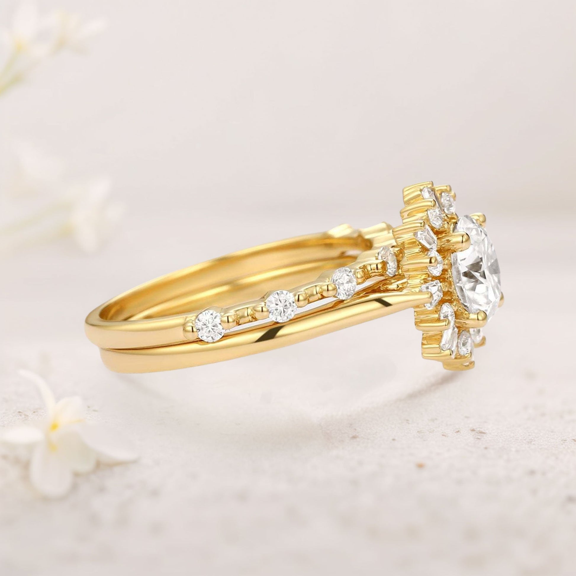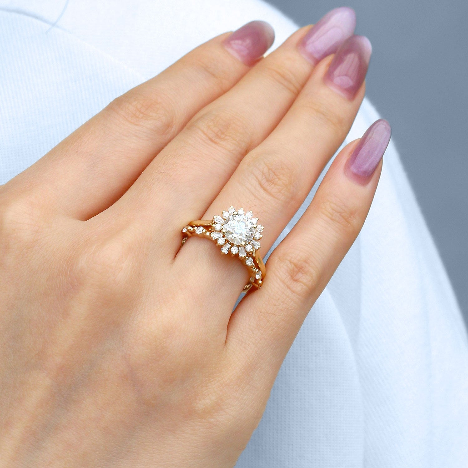 Unique floral engagement rings Round Moissanite Halo Floral Ring Set