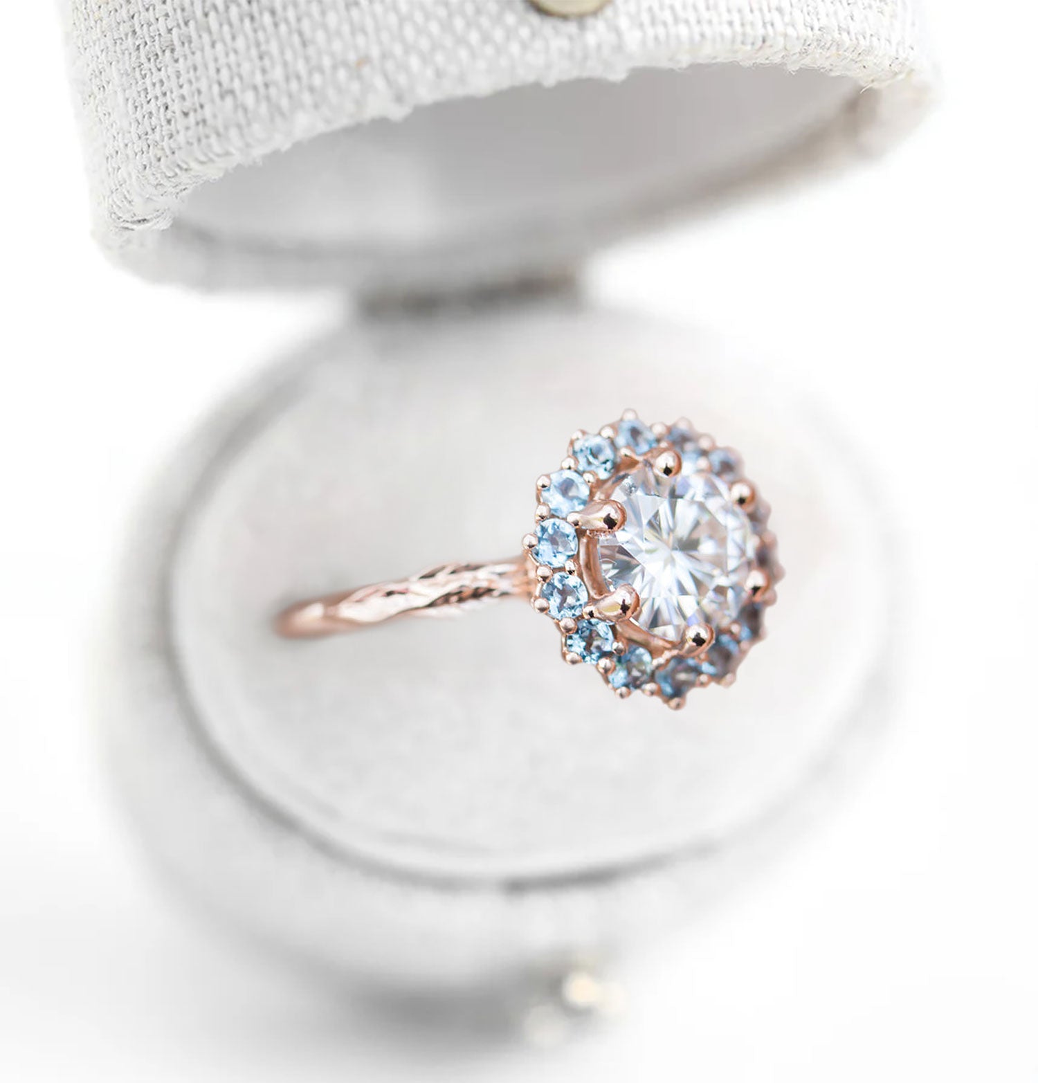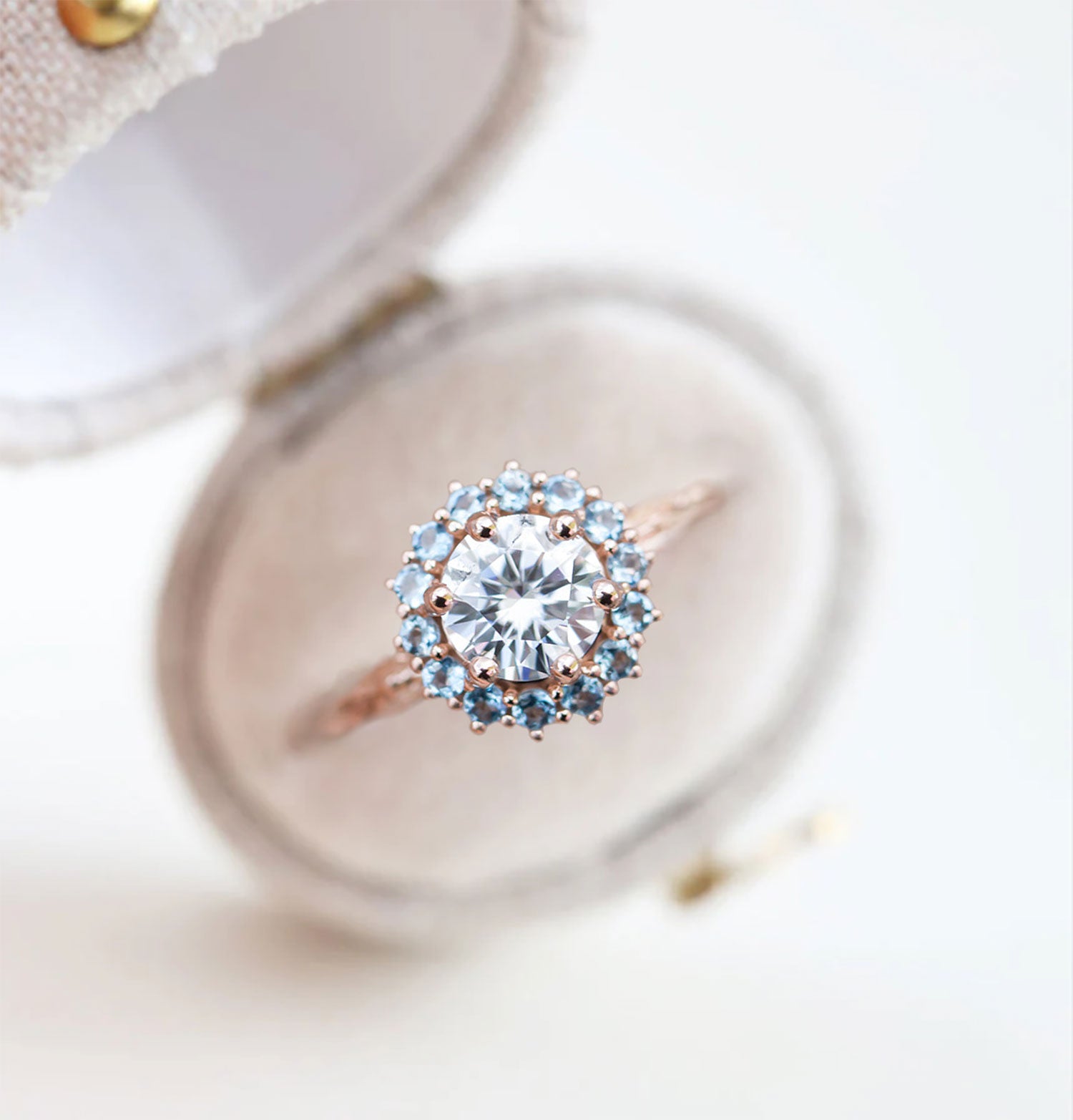 Unique Halo Midsummer Round Shaped Moissanite Ring