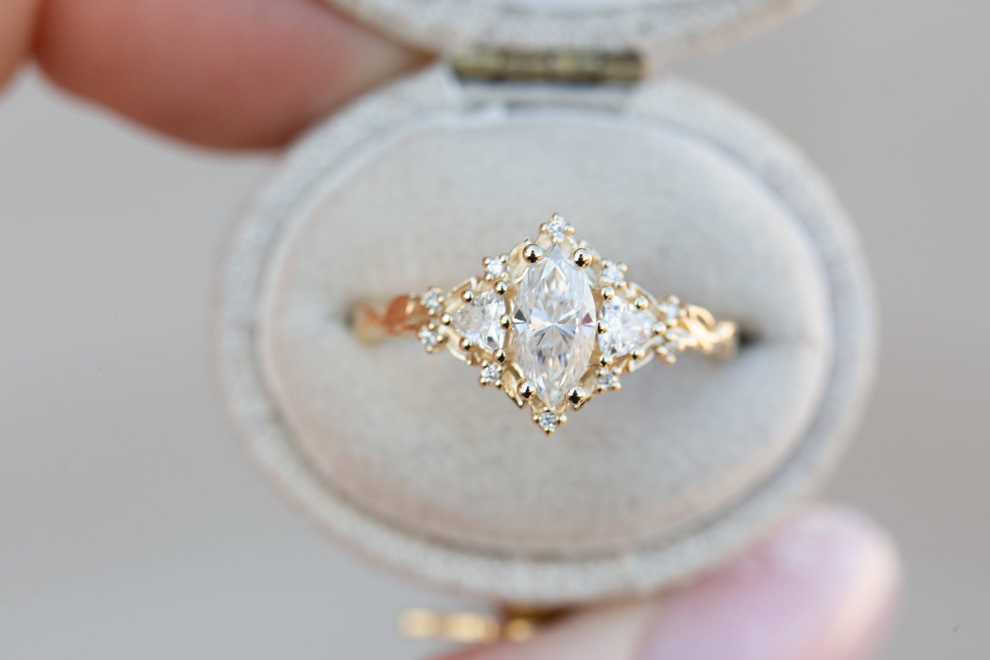 Unique Celeste Rose Three Stone Marquise Moissanite Ring
