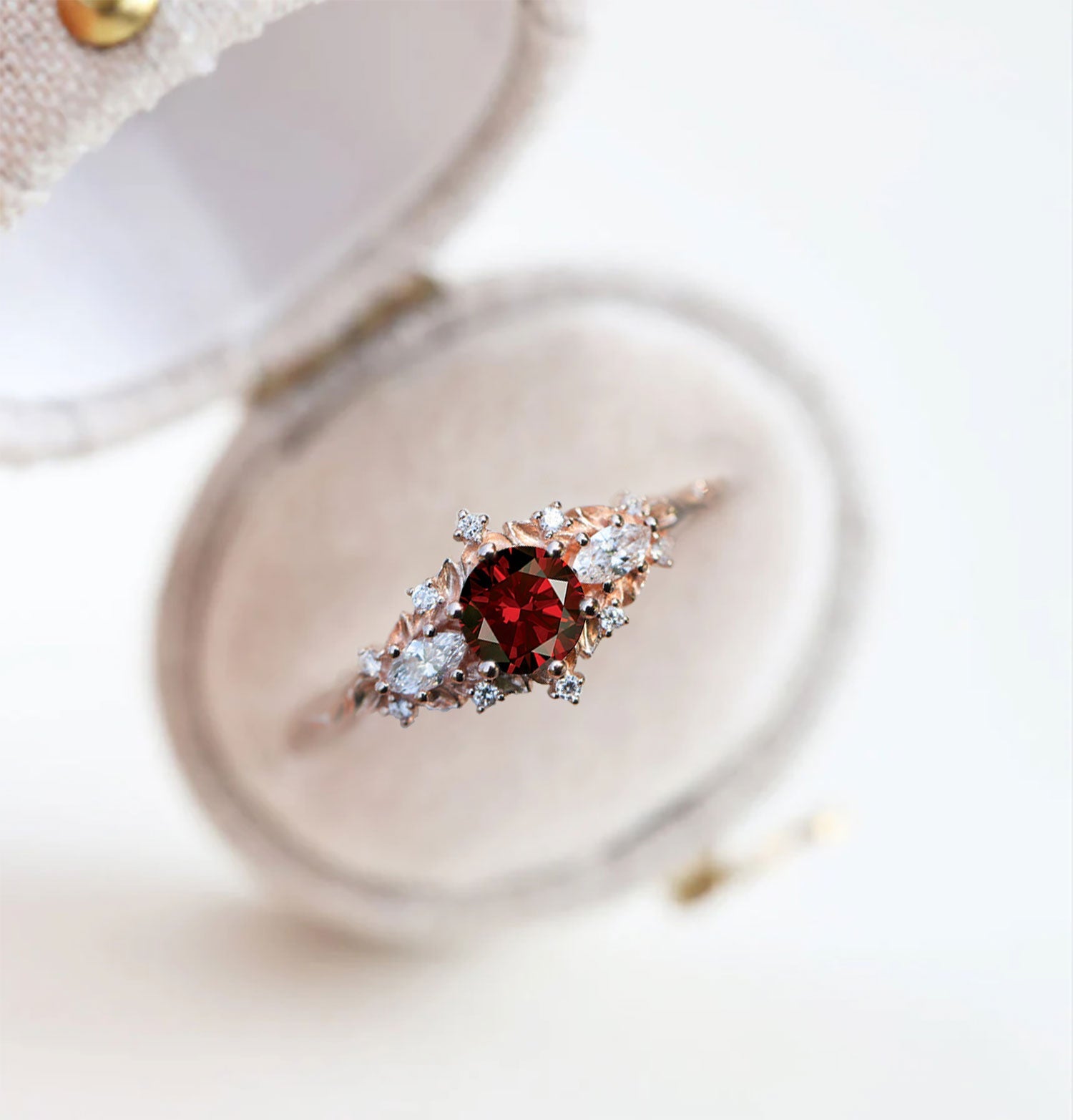 Unique Celeste Rose Three Stone Round Garnet Engagement Ring