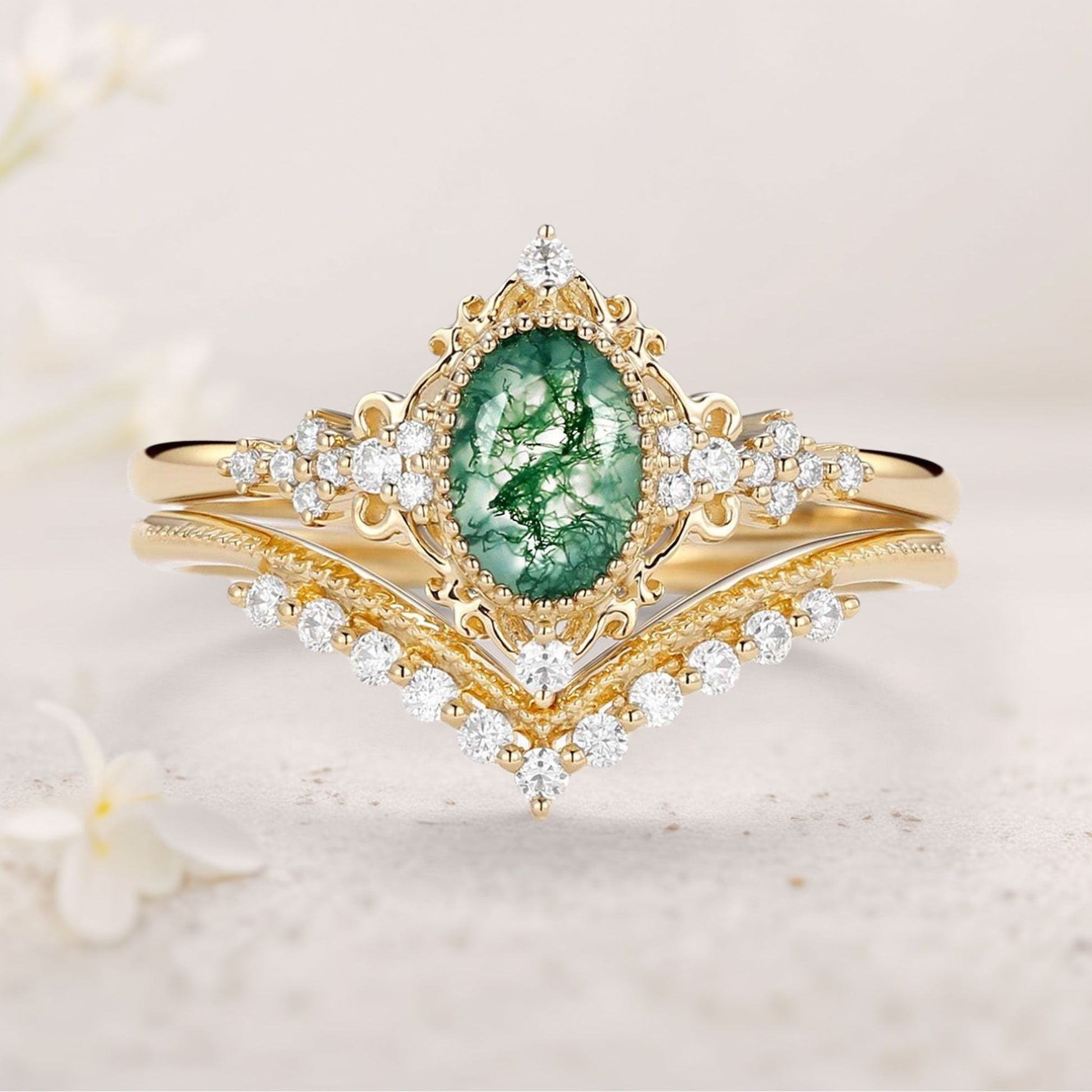 Vintage floral engagement rings Oval Moss Agate Milgrain Engagement Ring Set