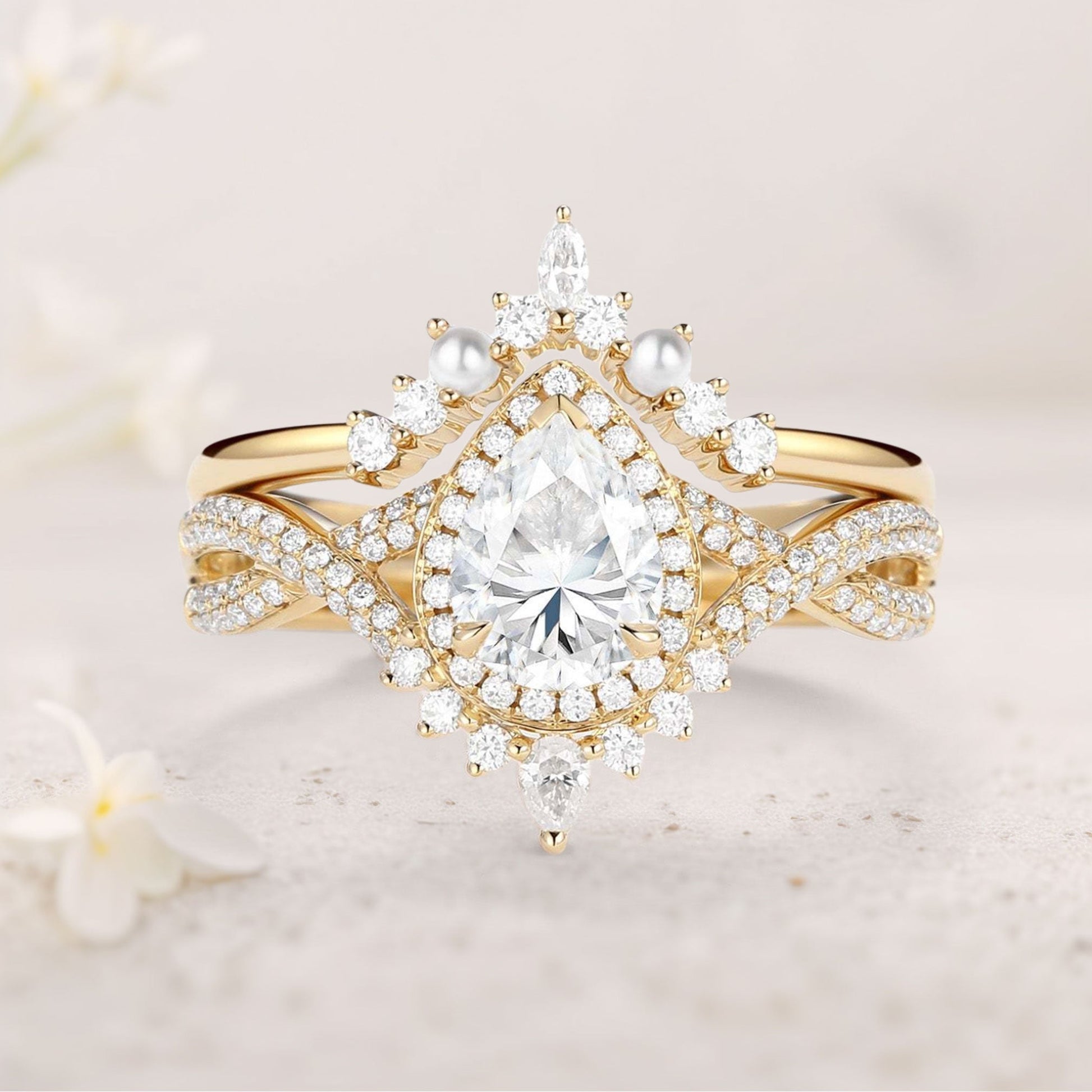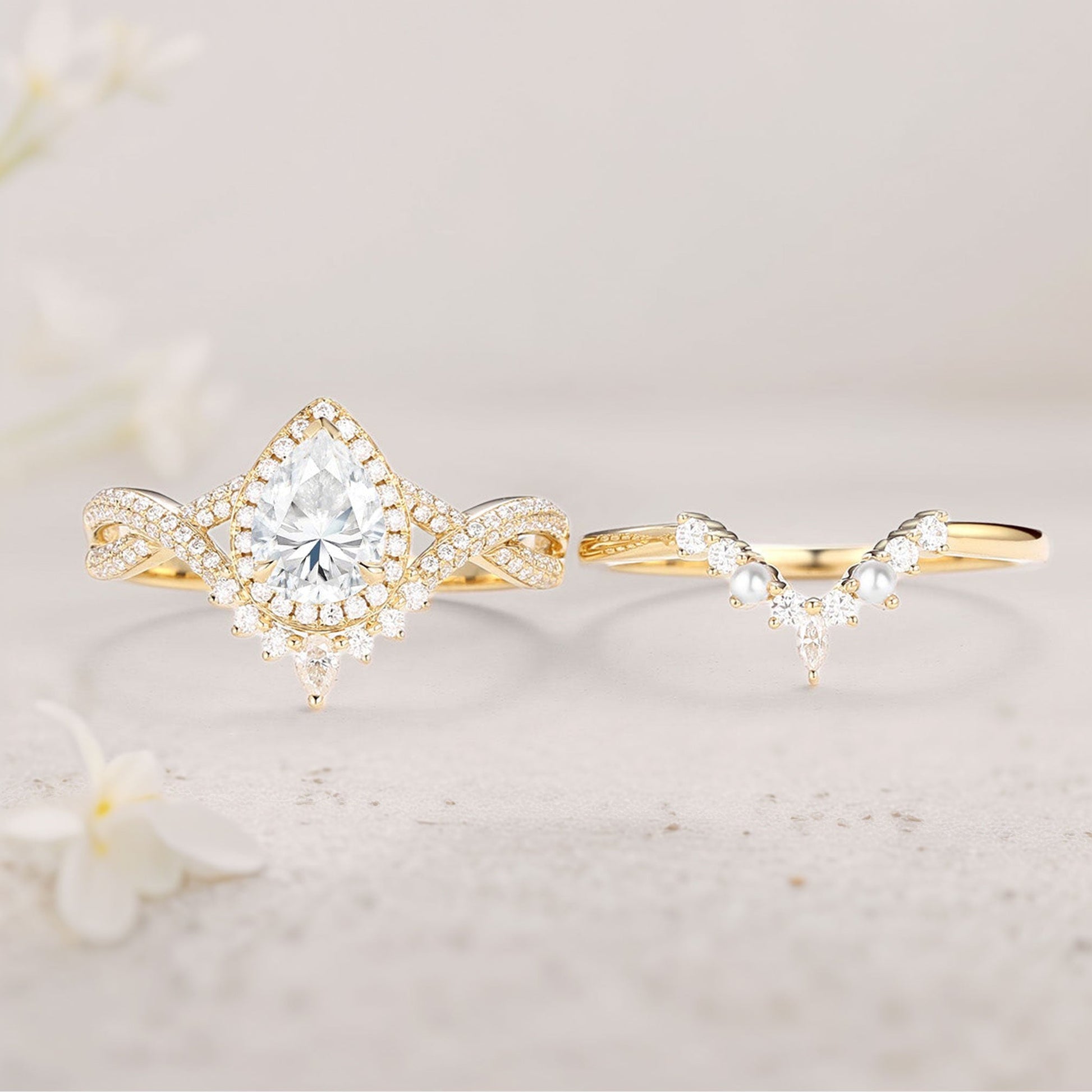 Vintage floral engagement rings Pear Moissanite and Pearl Halo Infinity Ring Set