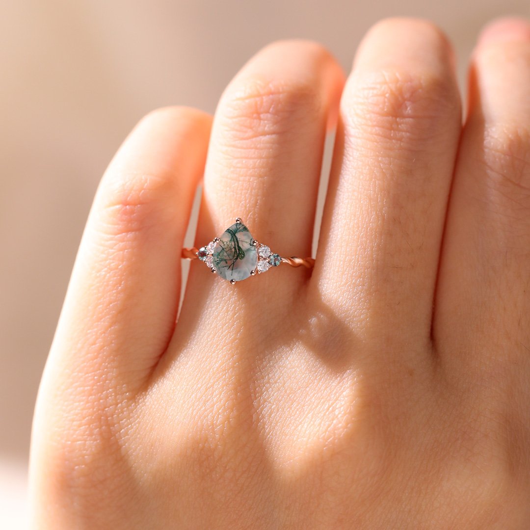 Vintage Pear Moss Agate Twisted Engagement Ring